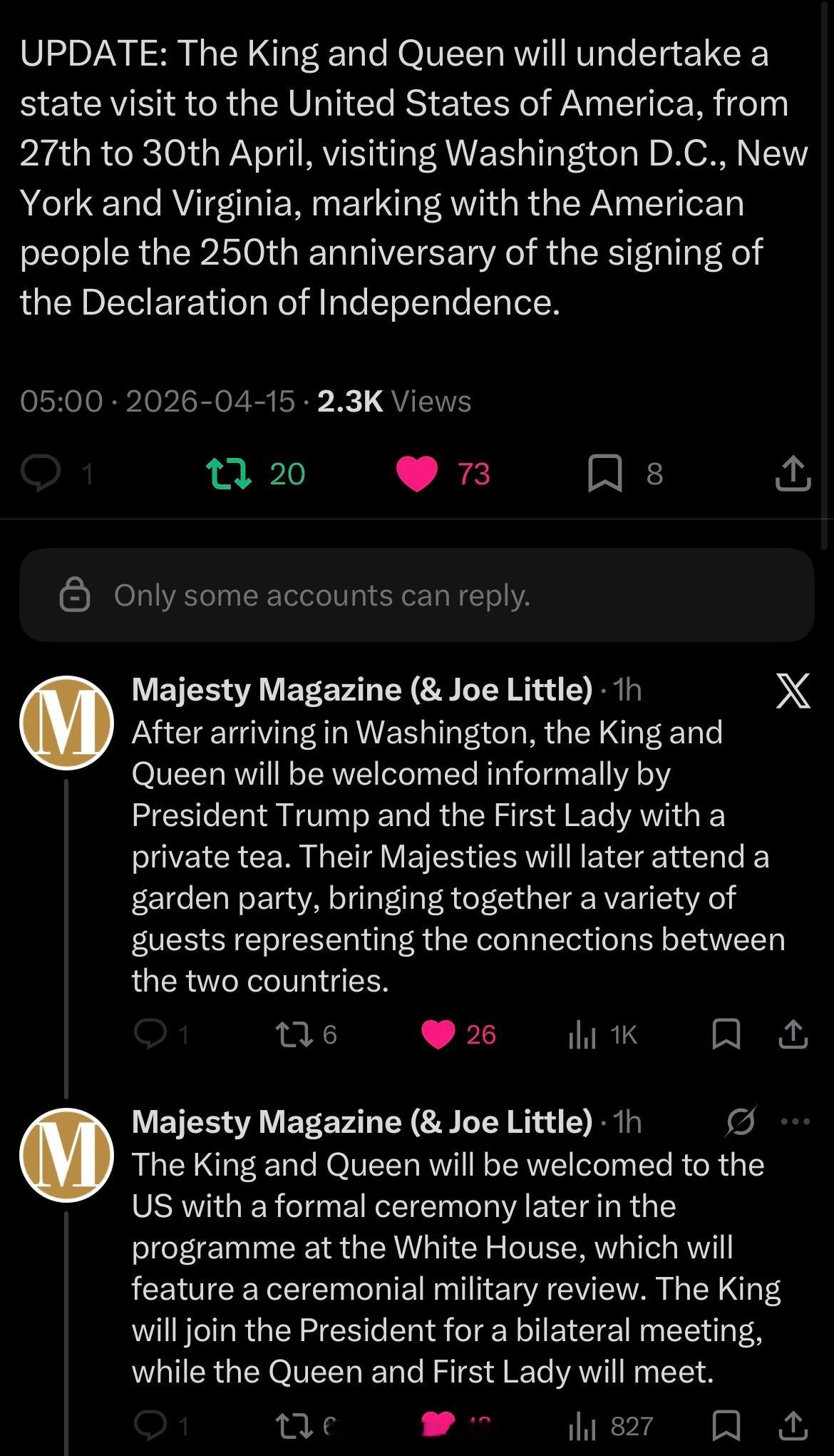 查尔斯三世和卡米拉王后对漂亮国进行国事访问的时间是4月27日至4月30日。【PS:4月29日是威尔士亲王夫妇结婚1️⃣5️⃣周年纪念日。】