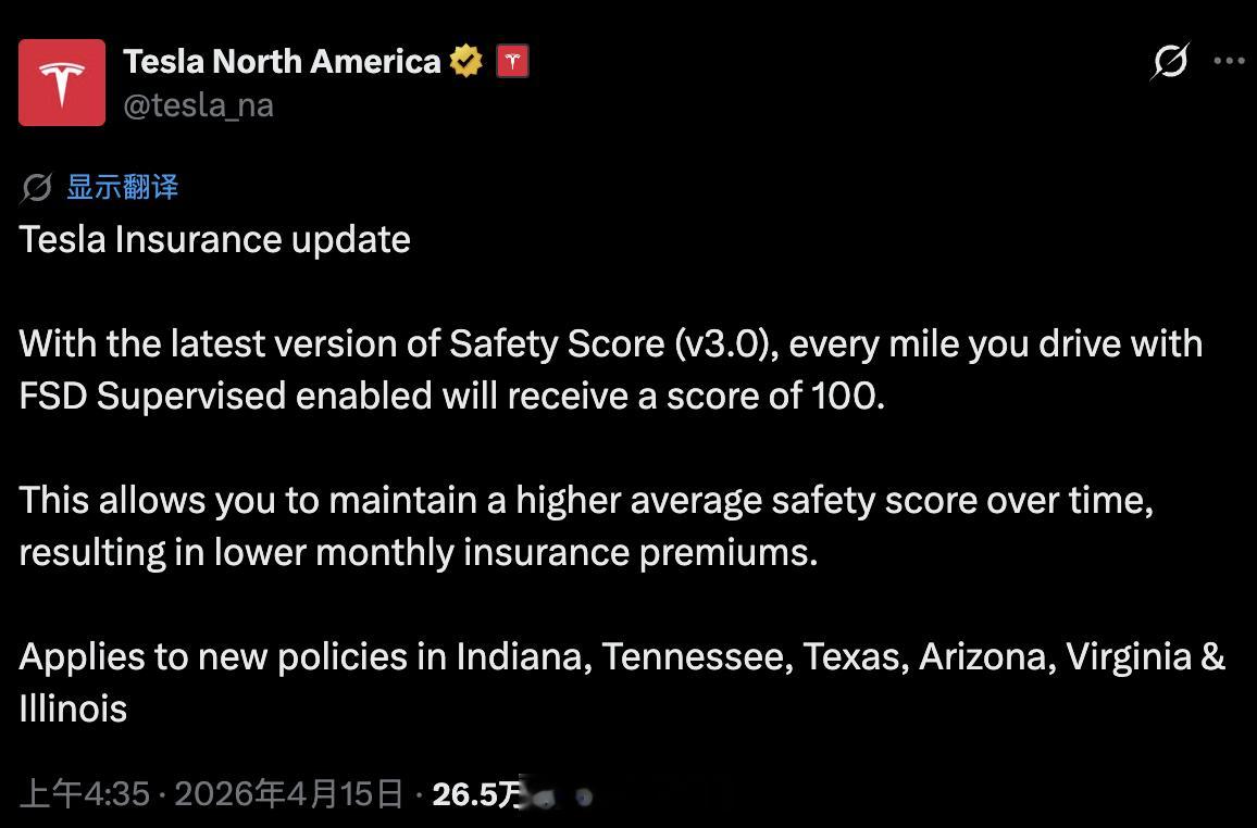 官方宣称:“随着最新版安全评分系统(v3.0)的推出,您在启用FSD监督功能下行驶的每一英里都将获得100分。这将有助于您长期保持更高的平均安全评分,从而降低每月的保险费率。”