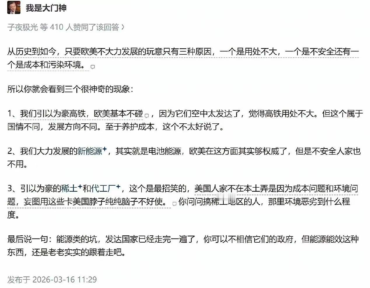 大殖子说:欧美不发展的产业就是用处不大的产业,或者是污染严重的产业。所以咱们的高铁、新能源、稀土产业都是欧美发达国家玩剩下的产业。 这个认知水平,顶多也就是小学生三年级以前的水平了。 你以为高铁就只是跑得快一点的火车?但实际上,高铁是技术含量非常高的一个行业。 它涉及到电力电气、通信信号、土木工程、机械制造、材料科学等等一大堆,哪一个是简简单单普普通通的? 稀土行业就更不要说了,是个人都知道,稀土可不是从土里挖出来就能用的。 那是需要应用到超高级的化学工艺,然后将里面各种各样的稀土元素分离萃取出来。 这个技术不是说其他国家没有,美国、日本还是掌握了的。 但是掌握技术也是分级的,咱们是顶级工程师,而他们还是初级技工。 这是天差地别的,就好像同样是电焊工,有些人只能焊门焊窗,而有些大神可以用来焊火箭、焊宇宙飞船。