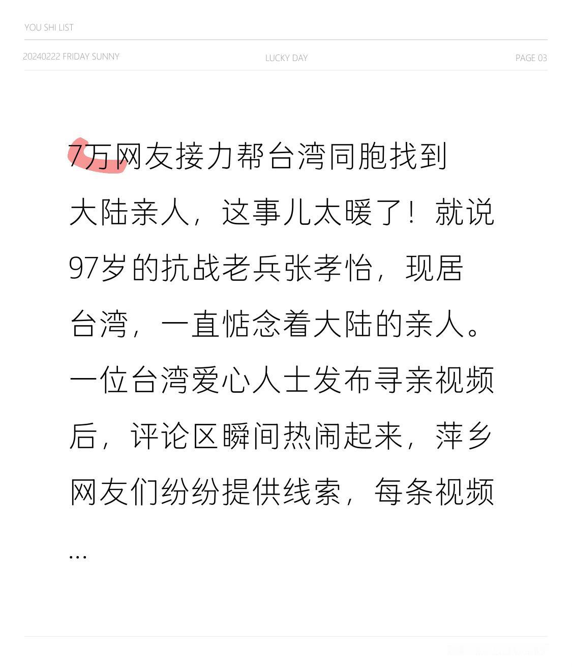 7万网友接力帮台湾同胞找到大陆亲人,这事儿太暖了!就说97岁的抗战老兵张孝怡,现居台湾,一直惦念着大陆的亲人。一位台湾爱心人士发布寻亲视频后,评论区瞬间热闹起来,萍乡网友们纷纷提供线索,每条视频都有上千条评论。 转机出现在萍乡网友张友强刷到视频时,他一下就认出这是失联多年的叔叔。他赶紧联系发布者相认。这一场跨越海峡的寻亲,不仅圆了老人的梦,更让我们看到两岸同胞血浓于水的亲情,为热心的网友们点赞!