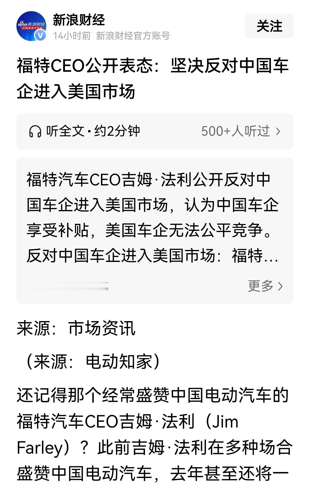 福特CEO吉姆·法利公开在多处场合表态:坚决反对中国车企进入美国市场,那是因为中国车“质优价廉”,是汽车市场十足的“鲶鱼”,也是让汽车价格更“亲民”的“价格屠夫”!毫无疑问,这让美国的资本感到非常不安和焦虑!