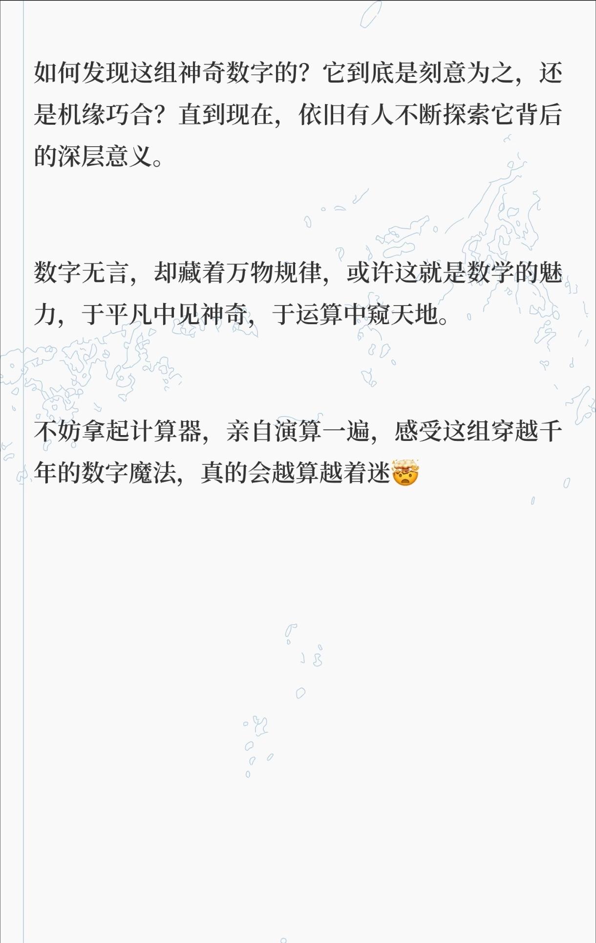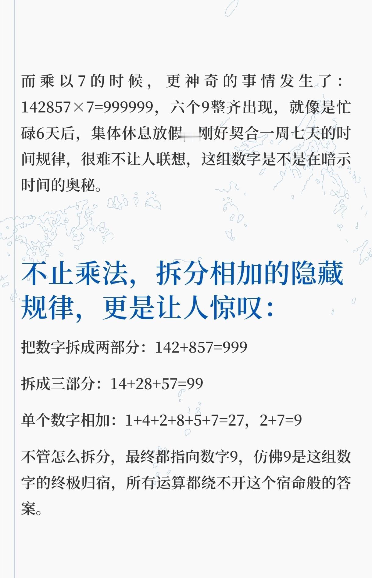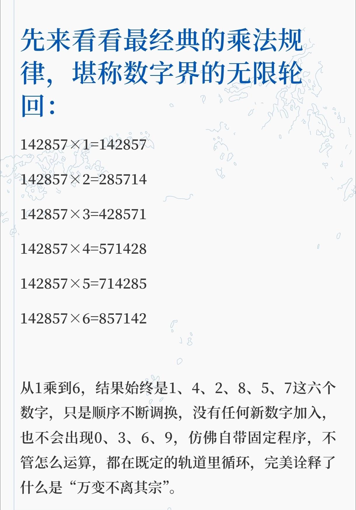 世界最诡异数字142857,乘到7直接变9? 因为1÷7的高阶余数会历遍小于7的所有正整数,同理5882352941176470也可以 还有个冷知识,任何一个能被3整除的数,每一位加起来,依然能被3整除。