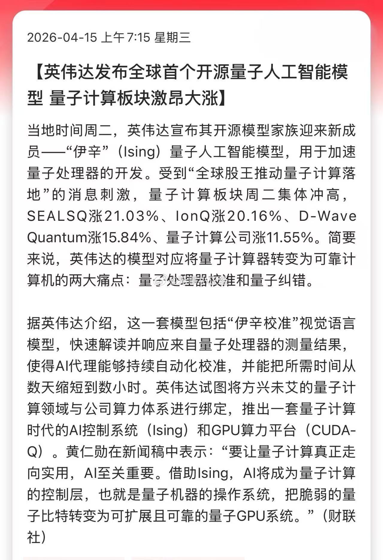 英伟达发布全球首个开源量子人工智能模型 量子计算板块激昂大涨