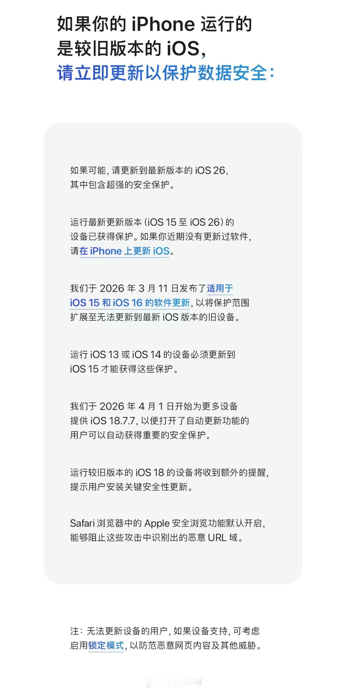 “安全研究人员最近发现,存在一些基于网页的攻击,会借助恶意网页内容,对过时版本的iOS 发起攻击。如果使用的是较旧版本的iOS,一旦点按恶意链接或访问被入侵的网站,iPhone 上的数据就可能面临被盗的风险。”