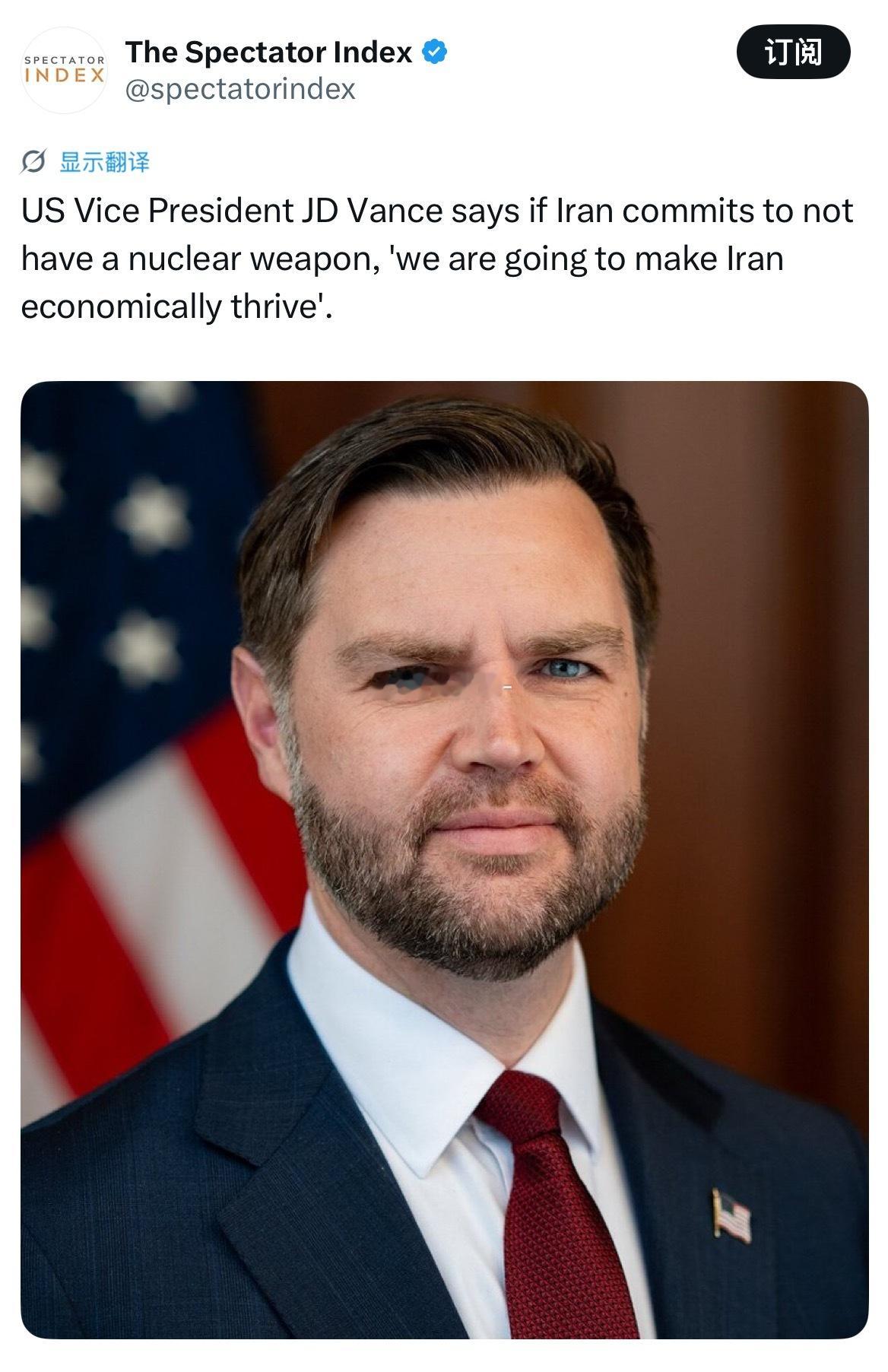美国副总统JDVance表示,如果伊朗承诺不拥有核武器,“我们将让伊朗在经济上