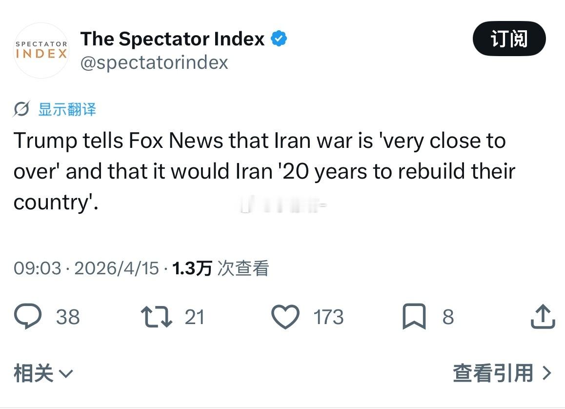 特朗普告诉福克斯新闻,伊朗战争“非常接近结束”,而且伊朗需要“20年时间重建他们的国家”。