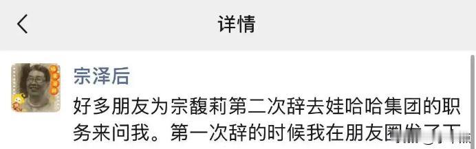 宗馥莉辞职后,其三叔宗泽后发声:水军害了她,使她越走越远、无法回头 娃哈哈宗馥 宗馥莉辞职后,10月11日,宗馥莉的叔叔宗泽后在朋友圈表示,好多朋友为宗馥莉第二次辞去娃哈哈集团的职务来问他。宗泽后表示,上一次她辞职,其说过一段话,那时她听进去就不会有今天这样的结局。“尽管网友或者水军把我骂翻天,但事实上都是这些人害了她,使她越走越远,已经无法回头了。”宗泽后还表示,不得不说在宗家下一代里宗馥莉算是出类拔萃的,但是对博大精深的中国文化了解太少,过去说要德艺双修才能成正果,还是欠缺了一些。