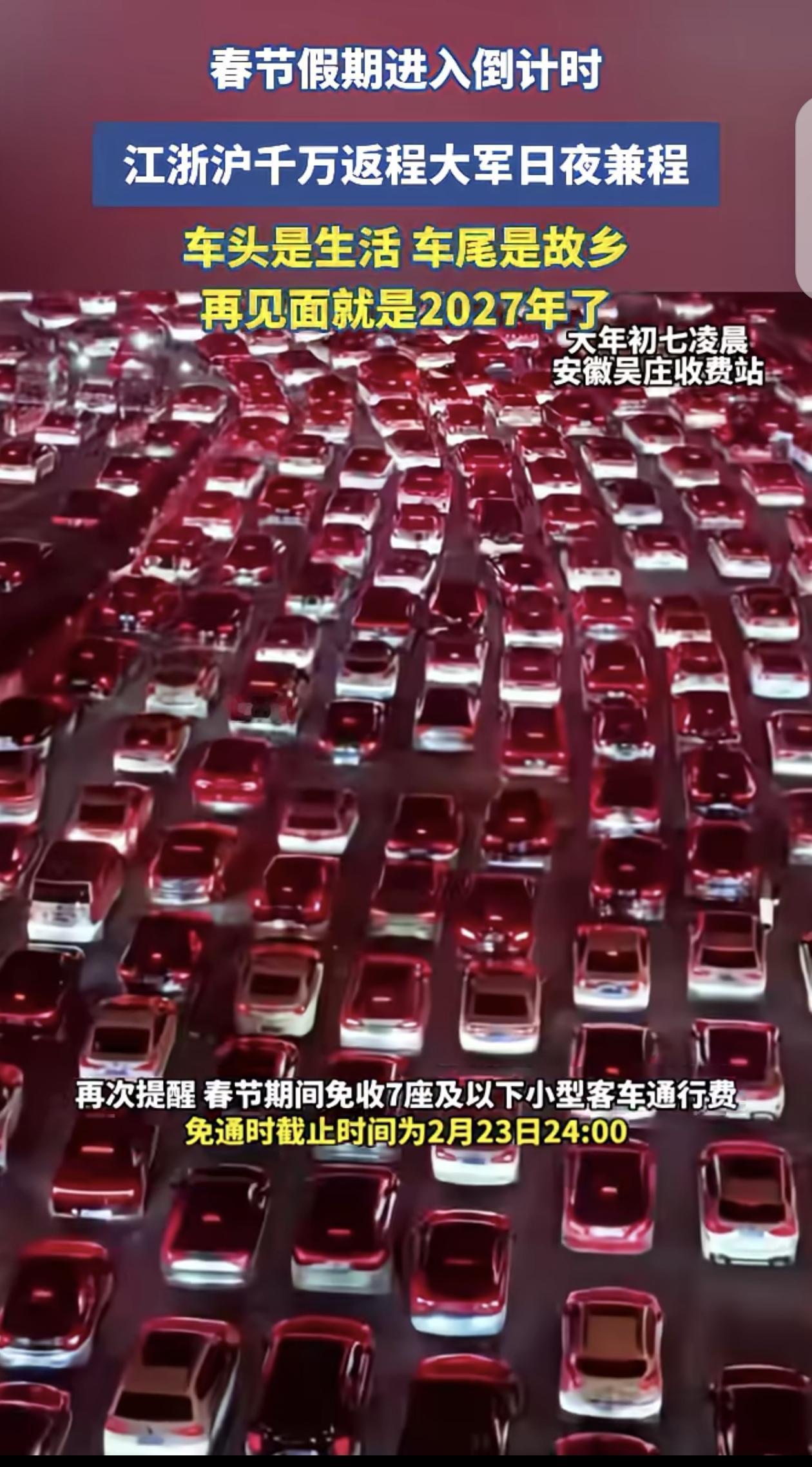 祝愿下次归来,仍是团圆。 大年初七,归途是一条长长的乡愁 今日正月初七,春节长假收官。天刚亮,外出务工、返岗上班的车流,便在城乡路口、高速干道汇成一眼望不到头的长龙。 红灯连成河,尾灯织成网,平日里轻快的路程,被拉得漫长又煎熬。走走停停间,有人望着窗外渐远的炊烟,有人摸着后备箱里塞满的年货,有人在心里默默和家人道别。 这一路拥堵,堵的是车,更是藏不住的牵挂与不舍。一边是放不下的故乡,一边是要奔赴的谋生路;一边是团圆的余温,一边是生活的催促。 我们都在同一条路上,带着年味与乡愁,缓缓驶向各自的远方。愿长路平安,奔波有尽头,辛苦都有回报,下次归来,仍是团圆。祝愿大家新的一年里工作顺利,健康平安! 天南地北大拜年