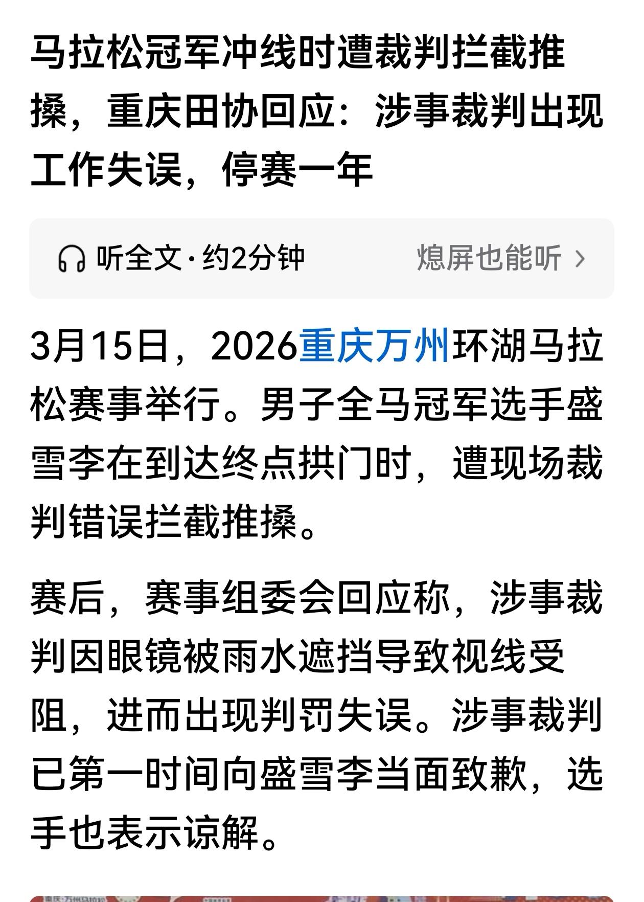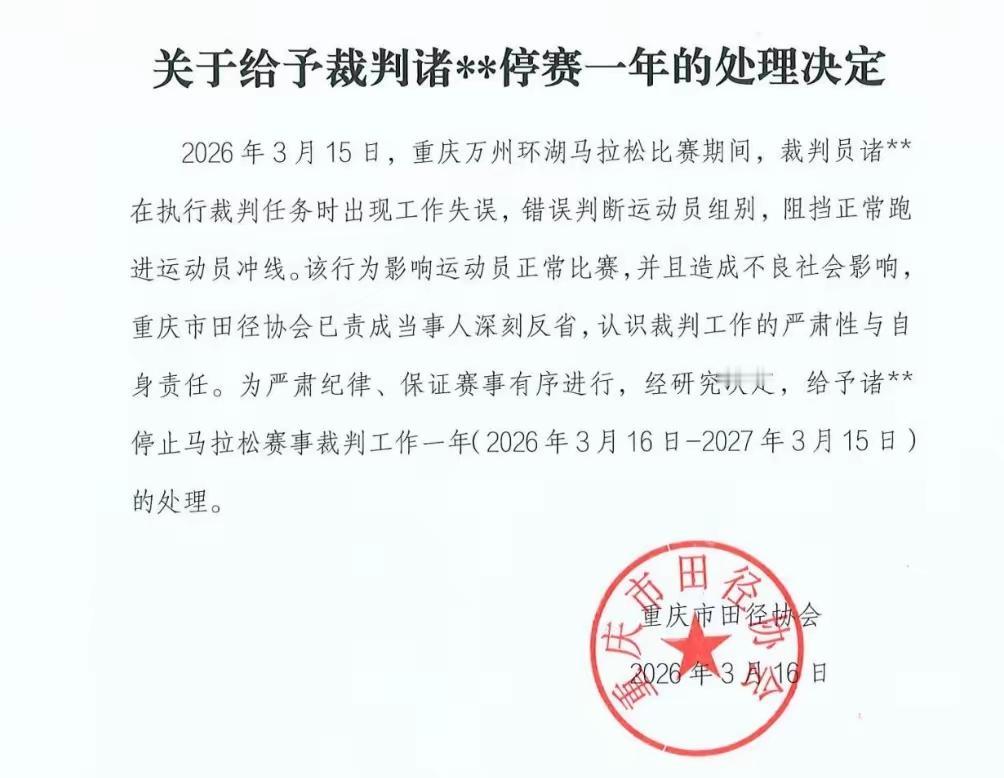 服了,真是服了! 真是什么奇葩事情都能发生,这种人到底是来当裁判的,还是来捣乱的?禁赛一年的处罚太轻了,应该永久禁赛才对。 这是在 3月15日,2026重庆万州环湖马拉松赛事上发生的一件怪事。男子全马冠军选手盛雪李在即将到达终点时,竟然遭现场裁判拦截推搡,不知道是什么意思? 赛后组委会回应称是因为涉事裁判眼镜被雨水遮挡导致视线受阻,进而出现判罚失误。这一理由实在是牵强至极,不能让人信服。 既然看不见为什么要去阻拦别人呢?让人百思不得其解! 春日生活打卡季