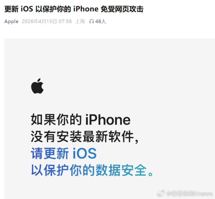 【#苹果警告旧版iOS存网页攻击风险#】4月15日,苹果官方服务号“Apple”发布《更新iOS 以保护你的iPhone免受网页攻击》提示。文内指出,安全研究人员最近发现,存在一些基于网页的攻击,它们会借助恶意网页内容,对过时版本的iOS发起攻击。