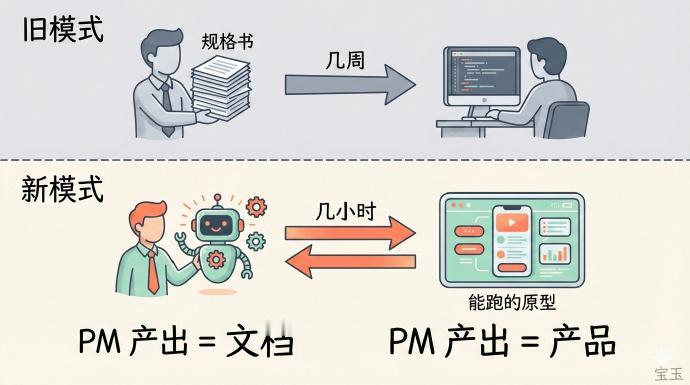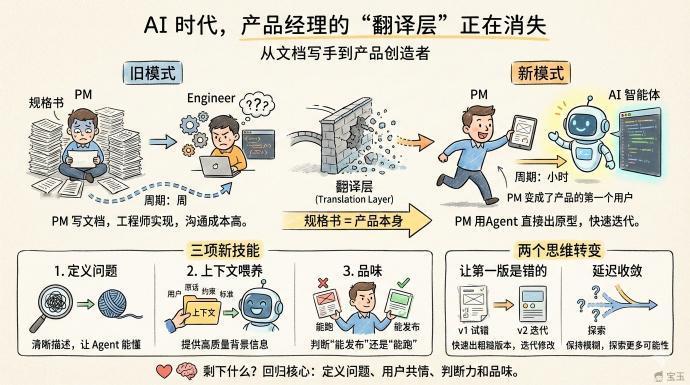 AI时代,产品经理最核心的“翻译层”正在慢慢消失🔍 过去PM要在用户和工程师之间做需求转译,现在AI直接压缩了这一环节。 效率从周级变成小时级,写清问题和约束,Agent就能快速跑出可用原型。 规格书不再只是文档,正在慢慢变成产品本身。 未来PM的价值不再是翻译,而是精准定义问题、喂好上下文、守住判断力。