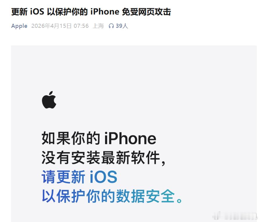 苹果官方发文提醒,近期工作人员发现存在一些基于网页的攻击,它们会借助恶意网页内容,对过时版本的iOS进行攻击,可能造成信息泄露
