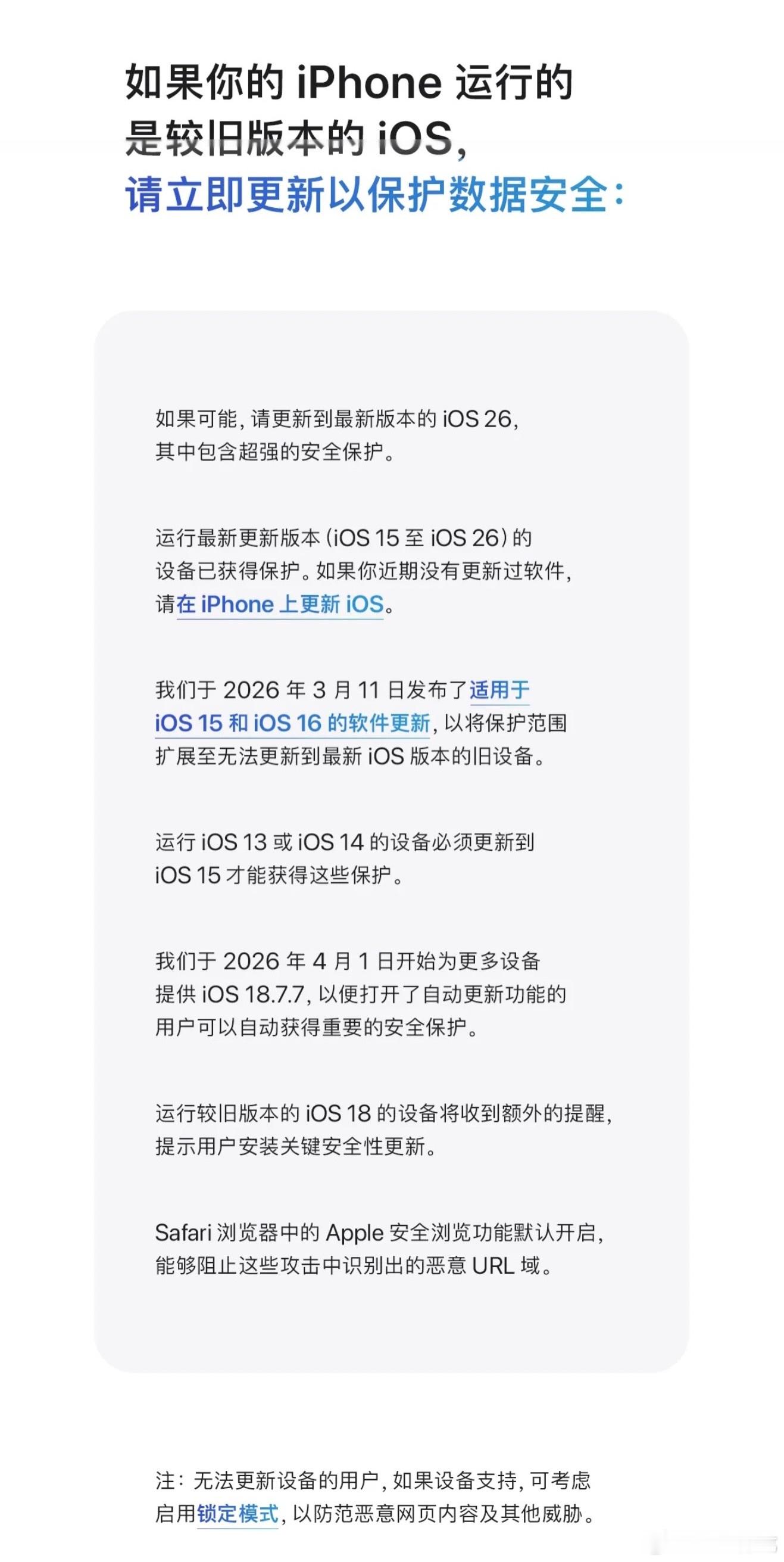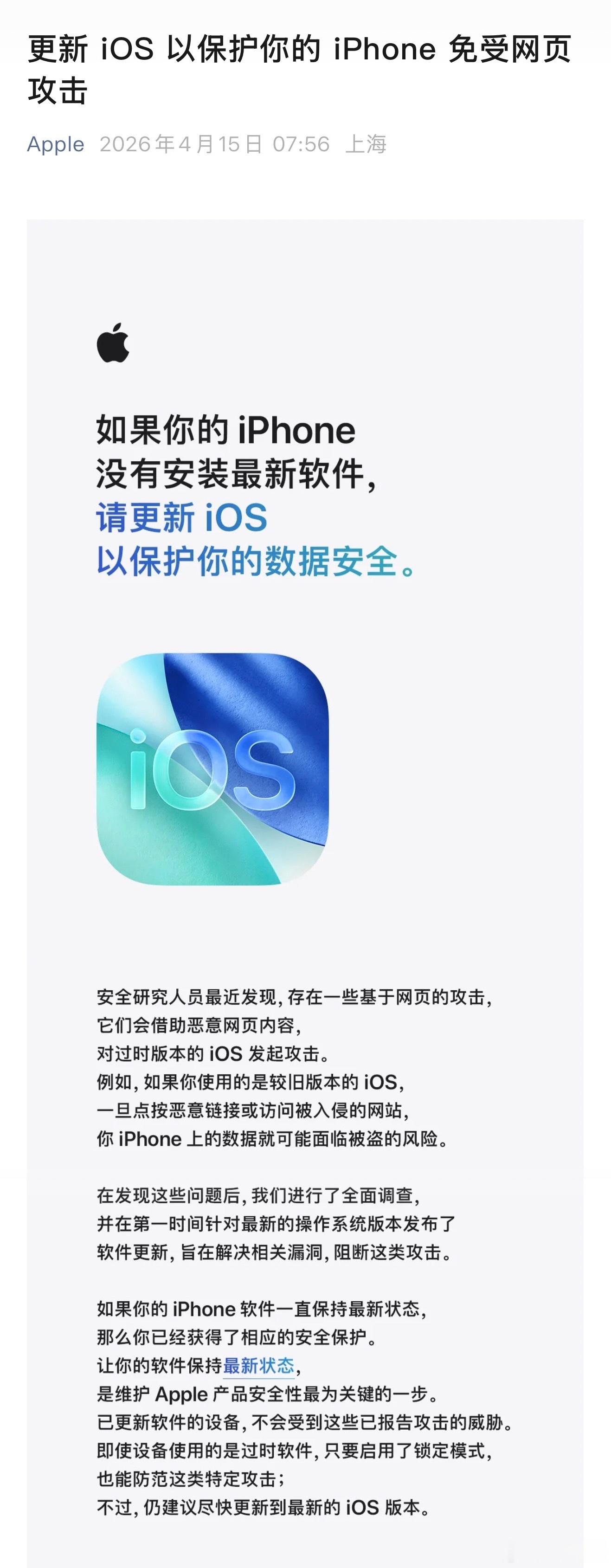 苹果官方发文提醒安全研究人员最近发现,存在一些基于网页的攻击,它们会借助恶意网页内容,对过时版本的iOS 发起攻击。点击钓鱼链接或访问被入侵网站可能导致数据被盗,最有效的方法就是安装最新版本的iOS,阻断这类攻击。