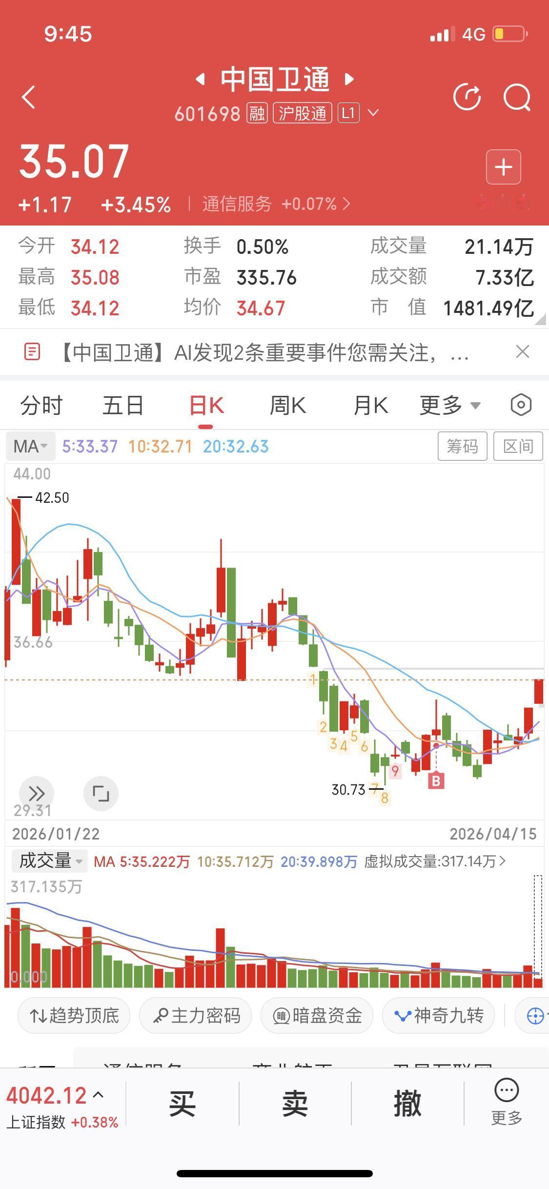中国卫通我持有了几周 从买入入套 到解套 我一直没操作 我确信底部放量主力资金入场了 我静静地等待 静等花开 还有一个重大原因 商业航天是重大项目 百年难遇 还没起飞,怎么会熄火