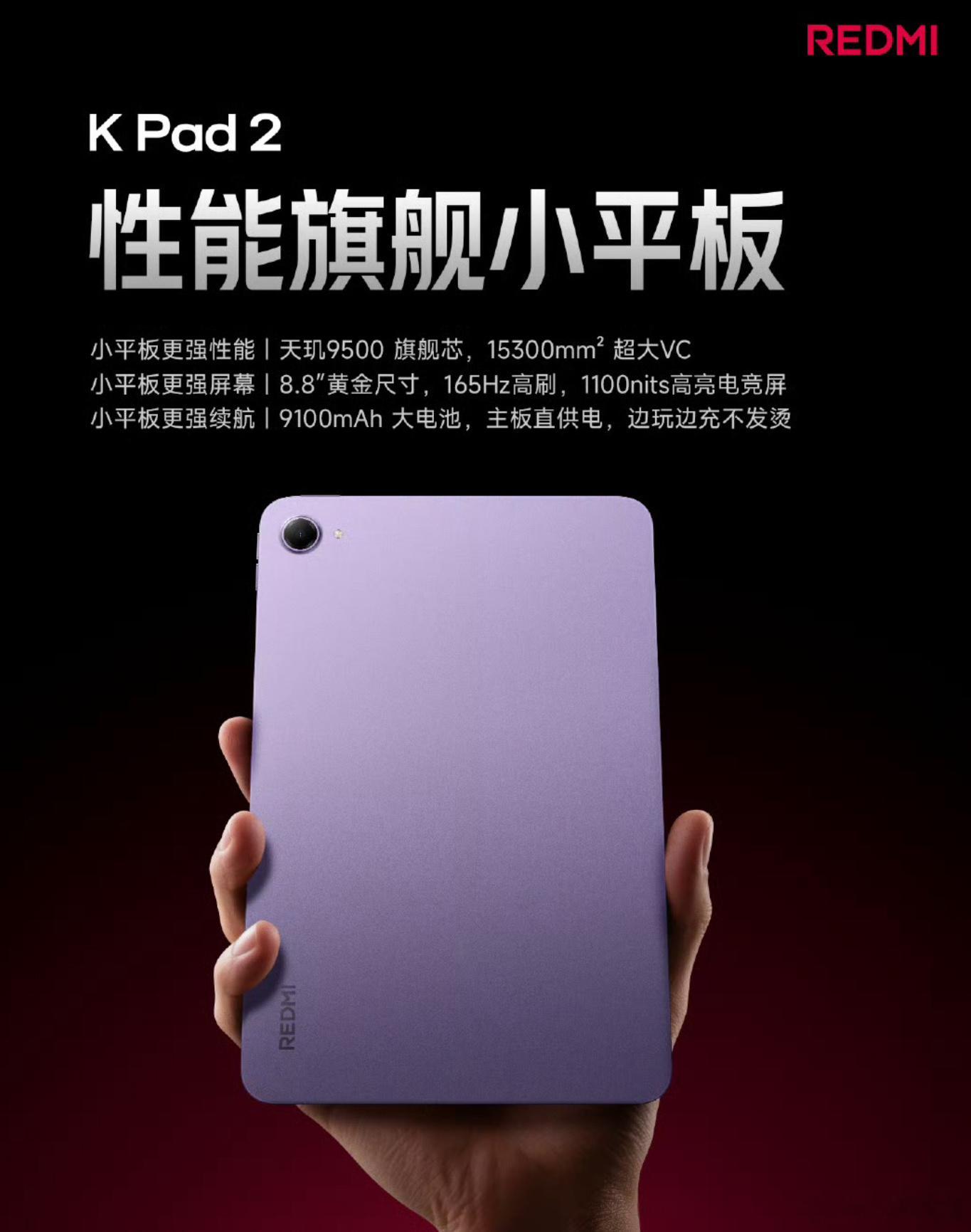 K Pad2:天玑9500,9100mAh电池,8.8英寸165Hz LCD屏(1100nits峰值亮度)