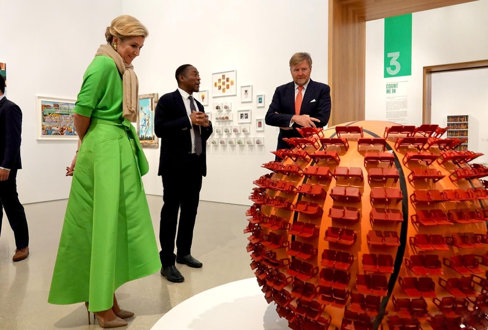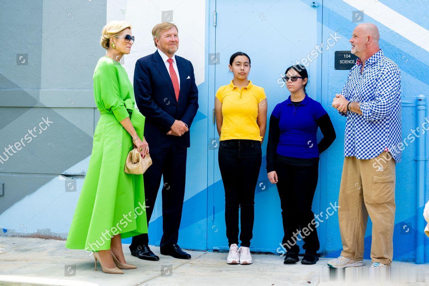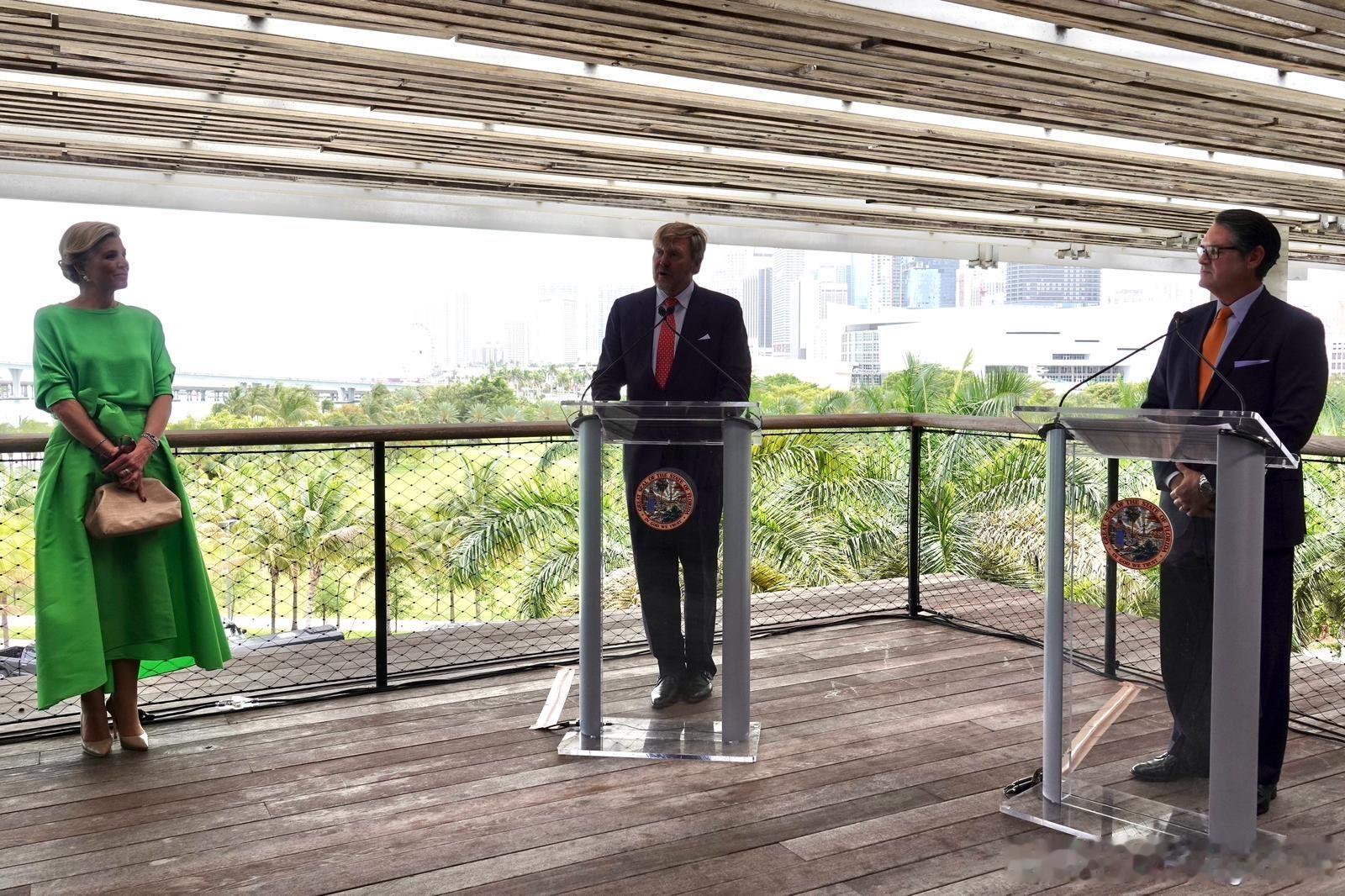 新闻 2026.4.14 荷兰国王夫妇工作访问美国Day 2,到访佛罗里达州的迈阿密,先是参观亨利·麦克小学,欣赏学生与荷兰和荷兰王国加勒比地区的艺术家们共同创作的壁画,随后访问佩雷斯艺术博物馆,美国国务卿科德·伯德出面接待并在博物馆举行圆桌会议,最后访问当地社区,与居民一起玩多米诺骨牌(一开始以为是麻将)和参观珊瑚实验室,玛克西玛的旧裙装来自Natan。
