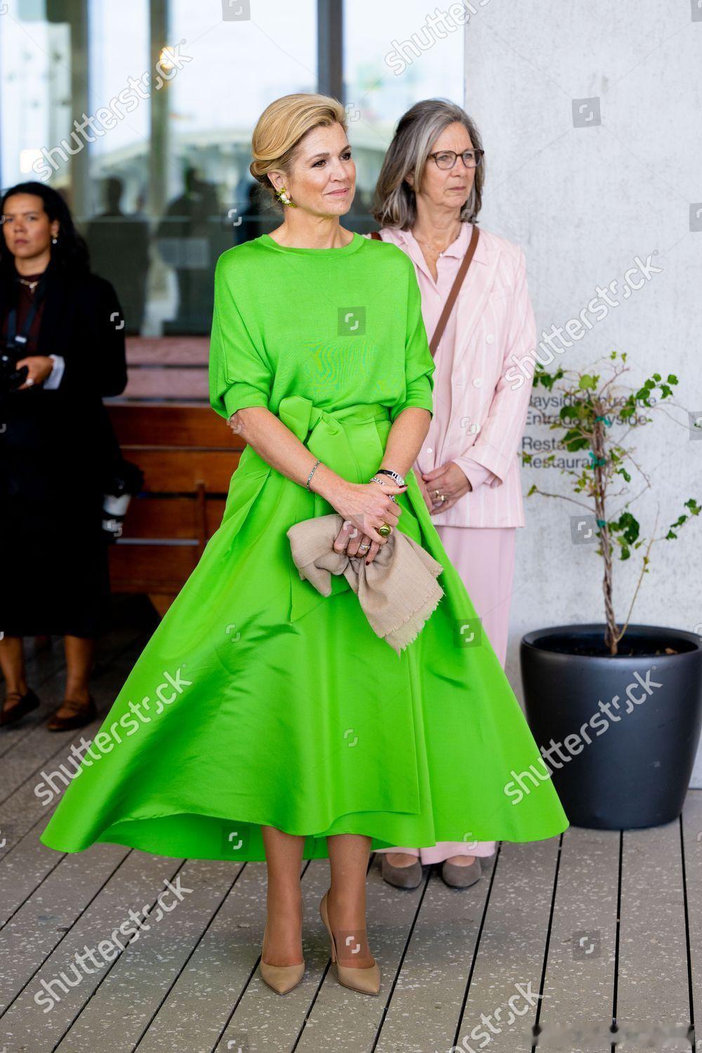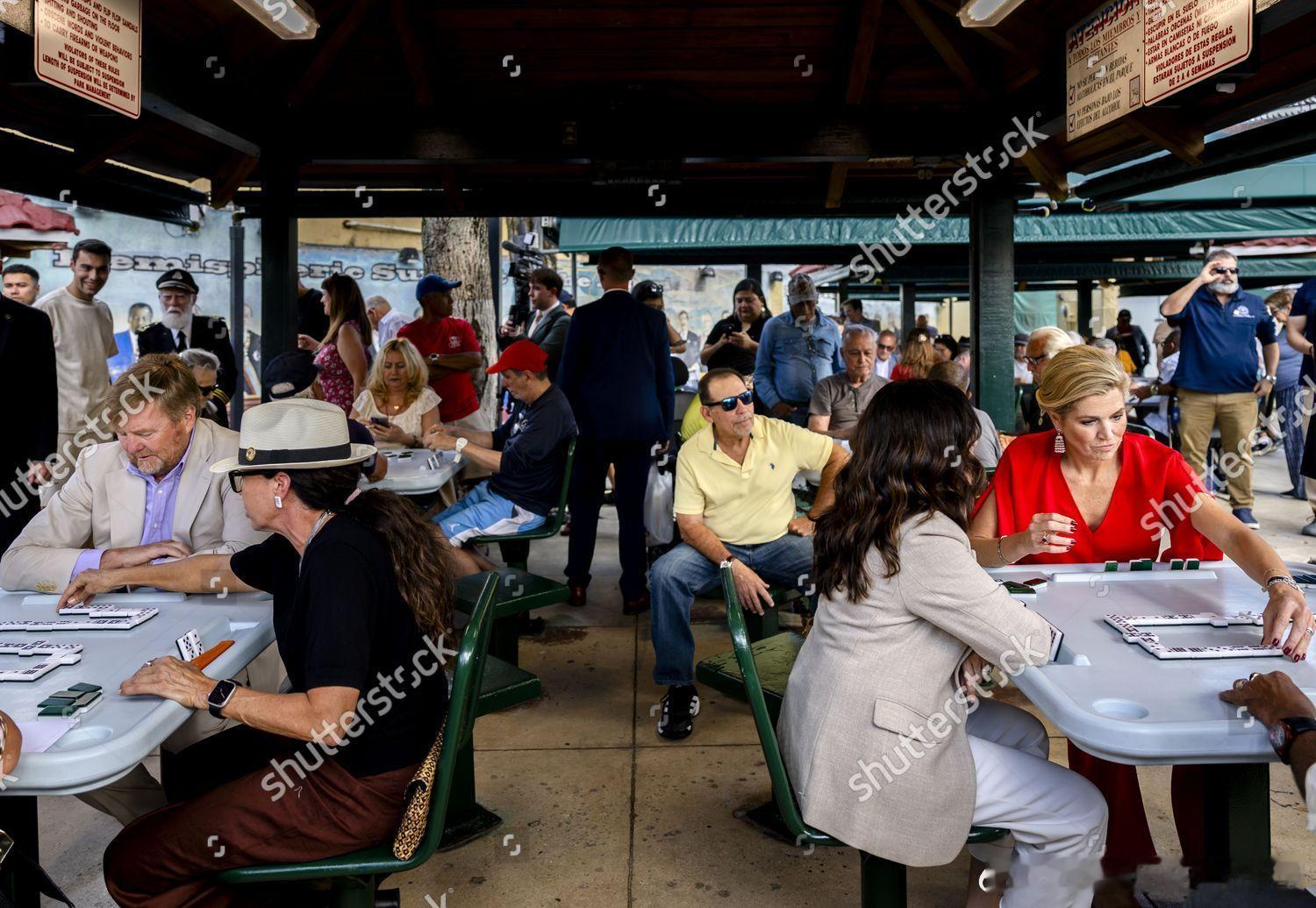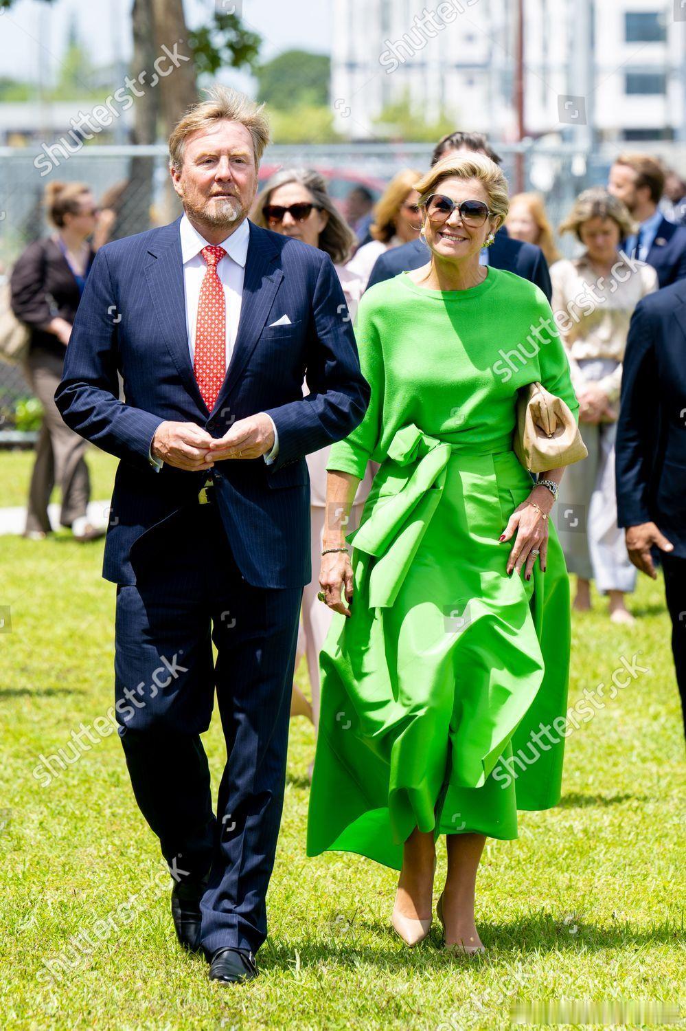 新闻 2026.4.14 荷兰国王夫妇工作访问美国Day 2,到访佛罗里达州的迈阿密,先是参观亨利·麦克小学,欣赏学生与荷兰和荷兰王国加勒比地区的艺术家们共同创作的壁画,随后访问佩雷斯艺术博物馆,美国国务卿科德·伯德出面接待并在博物馆举行圆桌会议,最后访问当地社区,与居民一起玩多米诺骨牌(一开始以为是麻将)和参观珊瑚实验室,玛克西玛的旧裙装来自Natan。