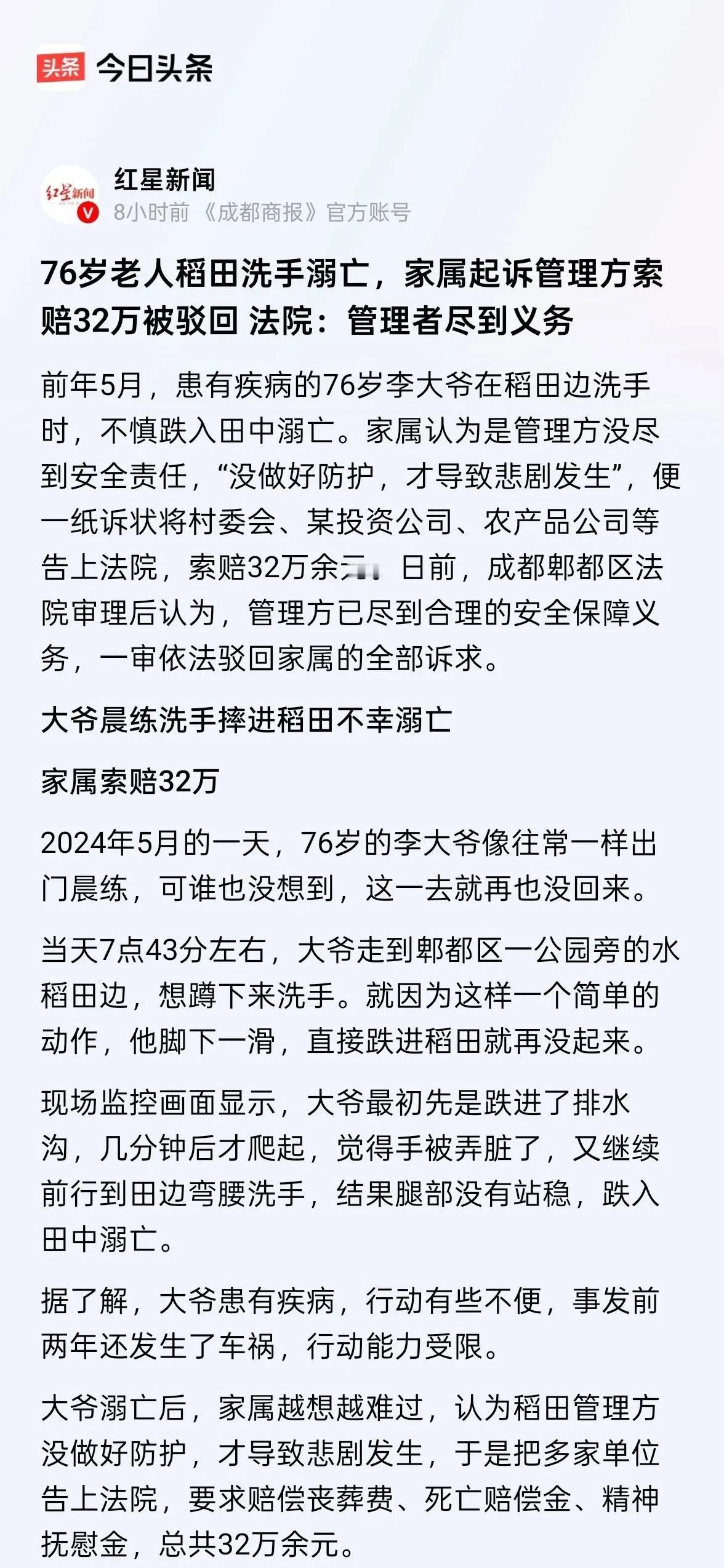 “并非谁死谁有理!”四川成都,一七旬大爷早起锻炼时,路过一片稻田,当他来到稻田边蹲下洗手时,不慎滑倒跌入田中溺亡。 而后,大爷的家属难过之余,将村委会、农产品公司告上法院,索赔损失合计320000余元,法院这样判了! 2024年5月的一个清晨,76岁的李大爷像往常一样出门晨练,沿着熟悉的路线走到一处稻田附近,谁也没想到,一次再平常不过的出门,竟成了和家人的永别。 当天早上7点43分,李大爷走到稻田边缘,想蹲下来洗洗手,没想到脚下一滑,整个人失去平衡直接摔进了田里。 监控把整个过程拍得清清楚楚:李大爷之前不小心掉进过排水沟,起身清理污渍后,又一次靠近田边,最终没能站稳落入稻田,再也没能自己爬起来。 周围群众发现不对劲后赶紧跑过去施救,等医护人员赶到时,李大爷已经没有了生命体征,不幸离世。 李大爷年纪大,本身就有基础病,两年前还出过车祸,行动比普通人迟缓很多,这也是他落水后没办法及时自救的关键原因。 这片稻田水深大概80厘米,是种水稻的正常深度,对身体没问题的成年人来说,根本不至于溺亡。 家人突然离世,家属们陷入深切悲痛,为厘清事件责任,认为村委会和农产品公司未对稻田区域做好安全防护,未充分消除潜在危险,应当承担相应赔偿责任。 他们把丧葬费、死亡赔偿金、精神损害抚慰金等各项损失核算后,向法院提起诉讼,要求赔偿共计32万余元。 法院受理案子后,对着监控视频、现场勘查记录、鉴定报告还有各方的说法,把事情的来龙去脉查得明明白白。 法院查出来,涉事稻田是农产品公司直接管的,公司早就在田边显眼的地方放了安全警示牌,明明白白写着水深危险、禁止靠近,还专门派人日常巡查,该尽的安全保障义务都尽到了。 稻田是用来搞农业生产的,保持开放状态是种地的需要,管理方不可能把农田全封闭围起来,也没法预料到会发生这样的意外。 法院还指出,李大爷是有完全民事行为能力的成年人,清楚自己的身体状况和行动能力,明知道靠近水边有风险,还是主动走到田边,自身存在明显过错。 家属对高龄且行动不便的老人,未尽到必要的陪同照看义务,对意外发生也存在相应责任。李大爷的溺亡结果,与管理方的经营管理行为之间,不存在法律上的直接因果关系。 最后,法院依照民法典和民事诉讼法相关规定,作出一审判决,依法驳回李大爷家属的全部诉讼请求,村委会、农产品公司等相关方无需承担赔偿责任,该判决现已生效。 判决结果公布后,迅速引发网友热议。 多数网友支持法院判决,认为法律应当厘清责任边界,以事实为依据作出公正裁判,管理方已尽到义务,不应为个人自主行为导致的意外承担责任。 也有网友温馨提醒,高龄老人外出活动,家属务必做好陪同与防护,避免独自前往危险区域。 在我看来,这起案子最有意义的地方,就是打破了“谁闹谁有理、谁死谁有理”的认知误区。 法律守护公平正义,以证据和责任划分为依据,兼顾情理与法理。 农田属于农业生产用地,管理方只要尽到合理的警示和管理义务,就应当得到法律的公正认定。 而作为完全民事行为能力人,应当对自身安全尽到注意义务,家属对高龄、体弱的亲人,也应履行好照看监护的责任,共同防范意外风险。 一场悲剧令人深感痛心,一次公正判决也为社会传递了清晰的法治导向:意外责任不盲目转嫁,公平公正才是法治社会的核心。 对于这件事,你怎么看?欢迎在评论区留下你的想法。