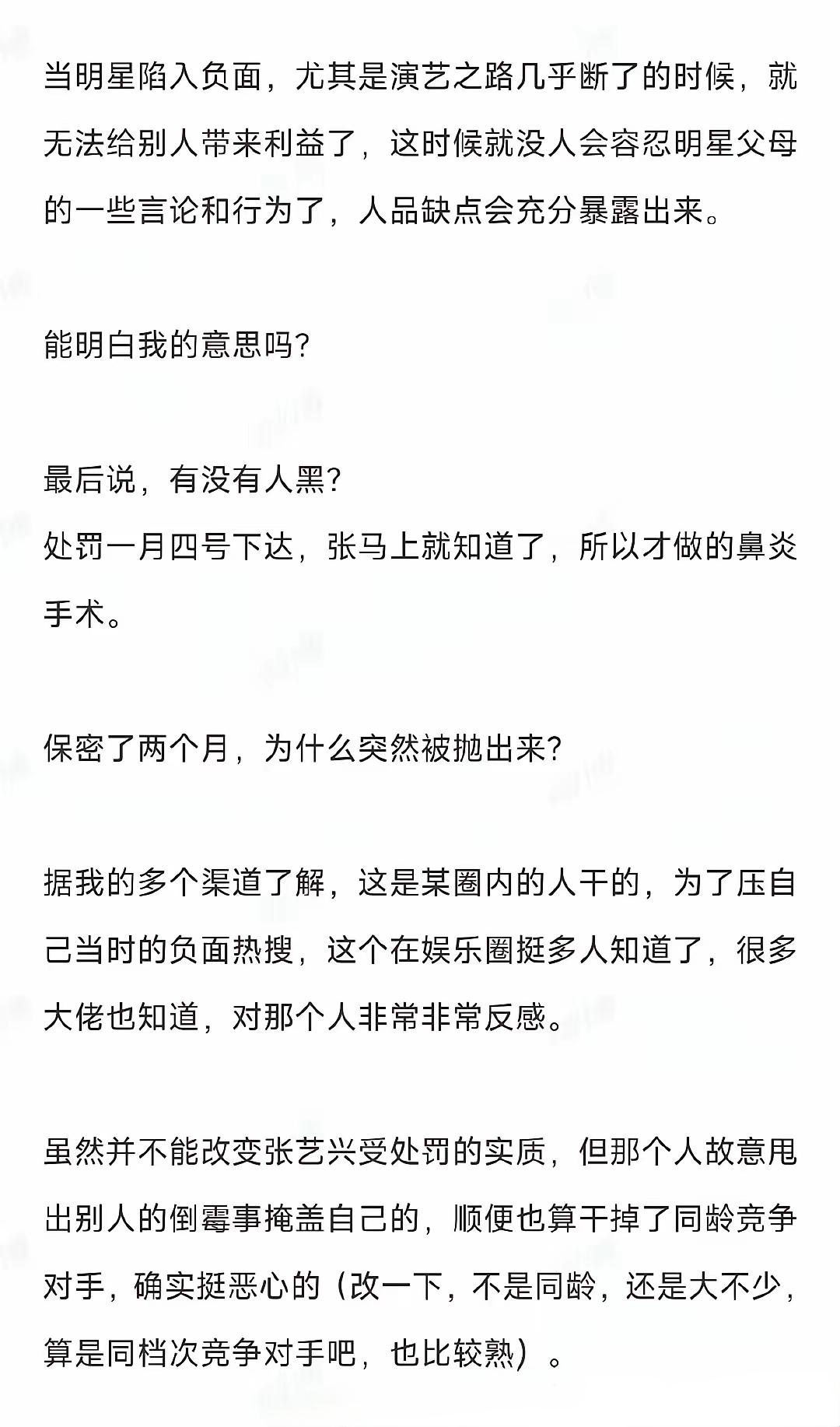 张艺兴风波再反转!爆料人自认被当枪使,张杰谢娜成最大疑云 张艺兴的瓜越挖越复杂,继此前“被处罚”的传闻引发热议后,关键爆料人“理记”突然发声,承认自己曝光张艺兴相关内容时被人利用,沦为转移舆论焦点的工具。 3月14日,理记发布长文澄清,称自己爆料的核心信息属实,但并非主动发起,而是受一对近期负面新闻缠身的圈内夫妻指使。 他透露,是女方主动提供材料让其发布,目的是帮丈夫遮挡负面评价。这波操作瞬间引爆讨论,网友迅速将矛头指向张杰谢娜夫妇。 眼下圈内舆论普遍反感这对夫妻,猜测并非空穴来风。 近期张杰在演艺工作中受到大众关注,谢娜也一直活跃在综艺相关领域,反观张艺兴,近期新剧官宣、代言不断,事业势头正盛,形成鲜明对比。 更有网友翻出过往相关讨论,指出此次事件的传播方式引发了大家的关注。 从理记的表述来看,此事引发了网友的广泛讨论。 女方主动对接、提前准备材料,符合有组织策划的特征。 类似爆料讨论在过往也出现过,顶流相关话题后,总有各类信息引发关注,专门在关键节点引发舆论热议。 如今大家对娱乐话题关注度较高,某种程度上也让这类话题受到更多关注。 不过也有声音提出质疑,谢娜与何炅、张艺兴私交都不错,这般情况似乎不符合常理。 但抛开争议,娱乐圈的各类话题讨论一直备受关注。 张艺兴一直走踏实路线,深耕音乐、影视领域,还担任国家话剧院演员,近期活动减少是术后康复,并非所谓“封杀”。 理记本身此前有相关争议,此次爆料的真实性也需理性看待。 说到底,娱乐圈的话题真真假假,粉丝和网友与其盲目站队,不如理性看待等待相关信息。 大家觉得这次爆料背后的夫妻,真的是张杰谢娜吗? 欢迎在评论区分享你的看法,一起理性吃瓜!