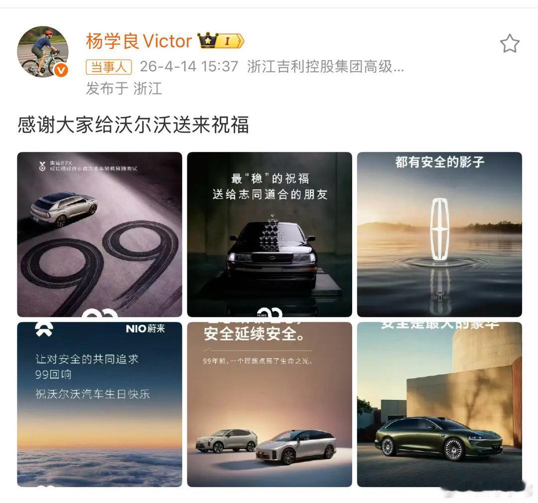 另一方面这是99周年啊,比很多品牌都老,还能让这么多人主动送祝福,是靠真本事。最后再次祝沃尔沃99周年快乐哇~吉利副总裁感谢车企祝福沃尔沃