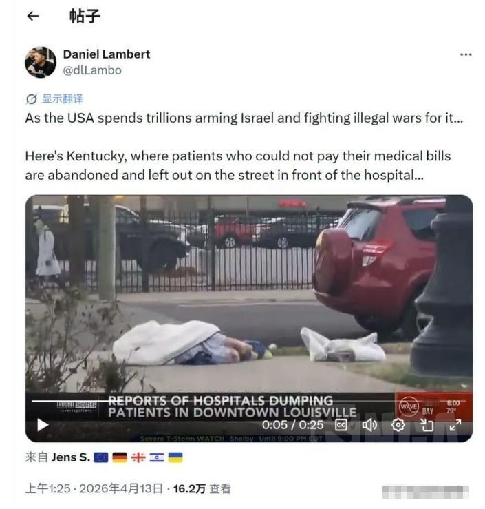 你敢信吗?美国一边砸数万亿美元,给以色列撑场打非法战争,一边让肯塔基州的病人,在医院门口自生自灭。 最近,路易斯维尔市中心医院的操作,算是彻底刷新了下限——没钱付医疗费?直接拖到街边扔着,反正资本主义社会不养“闲人”,这波魔幻操作让美国网友彻底破防,怒怼“军费花得眼不眨,百姓命贱如草芥”。 事实上,路易斯维尔的胡玛纳医院早有“前科”。1992年,婉达·约翰逊被卡车撞伤后送进这家医院,没保险没医疗补助的她,手术后刚脱离重症就被医院盯上了。 明明肺部还在发炎、高烧不退,医院硬是找了个疗养院接收,转头就把她转移出去。结果转院当天病情恶化,又躺了半年急诊。 官司打到最高法院,法官都判定医院违规——病人病情没稳定就转院,不管初衷如何都得担责。可判决下来又怎样?类似的事照样在美国各地上演。 更离谱的是加州那家叫“尊严健康”的医院,名字听着挺体面,做的事却毫无人性。31岁的糖尿病患者Jessie住院后,母亲接到女儿让接出院的电话,赶到医院却被告知“她自己走了”。 一家人找了整整一年,从焦急找到绝望,最后才知道女儿早就在医院死了。遗体被藏在医院外的仓库太平间,腐烂到纹身都看不清,连开棺葬礼都办不了。 医院明明全程知情,却对着家属撒谎,就为了逃避救治欠费的麻烦,直到证据瞒不住才松口。 新墨西哥州的唐娜更倒霉,感冒去急诊挂了两袋盐水、开了点抗病毒药,居然收到6000美元账单。这可是她税前年薪的10%,付不起就被医院起诉,连房子都可能被收走。 她身边的例子更触目惊心:好友肩膀脱臼,最后把房子抵押给医院;三个孩子的母亲因为孩子哮喘就医,被医院起诉了5次。 更讽刺的是,这家医院是当地唯一的选择,居民急病只能硬着头皮送上门,难怪网友吐槽“急诊室不是救命的,是放高利贷的”。 还有西弗吉尼亚州的94岁老人,患有老年痴呆需要全天候护理,却被医院独自留在故障浴缸里。 护士一个月前就提醒过热水器恒温器坏了,医院舍不得花250美元维修,结果老人被近60度的热水烫了近一小时,皮肤都融化了还没人发现。 四个护士被解雇了事,但背后暴露的问题根本没解决——对底层患者的生命,美国医院连250美元的成本都不愿承担。 黑人医生苏珊·摩尔的遭遇更让人寒心。自己就是医生,感染新冠后呼吸困难,请求做肺部扫描、用抗病毒药,却被医生拒绝,还暗示她是瘾君子。医生说“给你多开止痛药我不舒服”,转头让她出院。 12小时后病情恶化,最终死于并发症。她在视频里哭着说“黑人就是这样被杀死的,你得拿证据证明自己有病,白人就不用”。 数据更残酷,新冠死亡人数里黑人占比超70%,华裔死亡率更是白人的1.5倍,所谓的平等医疗,在美元面前不堪一击。 一边是百姓求医无门,一边是美国的军费账单节节攀升。2024年美国军费飙到9970亿美元,占世界总军费的37%,给以色列的援助说批就批,眼睛都不眨。 可在医疗保障上,53.7%的人靠雇主保险,一旦失业就大概率失去保障,35%到40%的低收入者失业后全无保障。 2700万美国人没保险,就算有保险也可能被高额免赔额坑——有的保险准赔金额高达7900美元,小病自己扛,大病扛不住。 网友的吐槽一针见血:“花数万亿美元杀外国人,却让自己人死在医院门口”“所谓的美国优势,就是把穷人的命当成成本省下来”。 有人翻出数据,3成美国人看不起病只能“弃疗”,23%的民众觉得医疗体系已陷入危机,可政府眼里只有战争预算。 这背后其实是制度性的冷漠。美国社保有个“斩杀线”,收入略超贫困线就会失去医疗补助,转向商业保险后自付费用暴增,形成“福利悬崖”。 大量家庭陷入“不够穷拿福利,不够富保平安”的困境,医院为了盈利,自然对欠费患者毫不留情——起诉、遗弃、隐瞒死亡,怎么省钱怎么来。 说白了,美国的“低人权成本”从来不是什么真优势,不过是把弱势群体的尊严和生命,当成了资本扩张和对外霸权的垫脚石。军费能砸出战争机器,却填不满医疗体系的黑洞;能给盟友送枪炮,却不给本国百姓留生路。 那些被扔在医院门口的病人,被藏在仓库的遗体,被起诉收房的普通人,都是这套体系的牺牲品。美国网友的破防,本质上是看清了真相:所谓的自由民主,从来不属于没钱没权的底层。 当医院变成逐利工具,当生命需要金钱背书,这样的“优势”,终究是用无数人的苦难堆出来的假象。