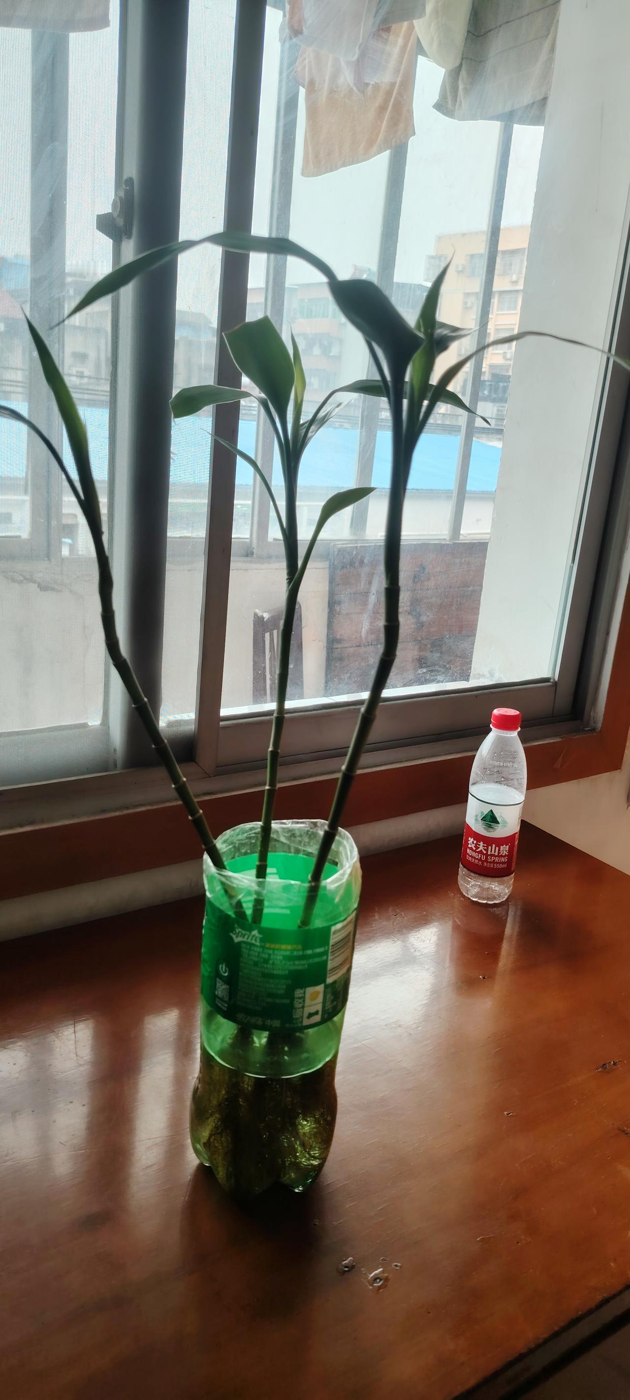 我可以肯定的告诉你:我的富贵竹养活了。从去年夏天到今年的4月15号,不知道经历了多少次死亡的危险。幸运的是我买的是3根带根富贵竹根,是个新手,也想图个吉利,三生万物。第一次黄叶的时候,我加营养液,第二次黄叶的时候去掉营养液。到了冬天气温5度以下的时候,放进卧室,用黑色的塑料袋罩上。过年以后他玩了几次心跳:放在阳台上晒太阳,叶子会大片变秧变黄,又拿回卧室,将营养液也没用,任凭叶子枯萎。关上玻璃窗,隔着玻璃晒了一天太阳,也是大面积黄,叶黄止都止不住啊,买回了硫化亚铁,好像止住了黄。再后来又喷雾多菌灵药,黄叶全部剪去,免得传染。再后来儿子说竹子的根须不能全部浸泡在水里,根须不能呼吸,再后来我又加了营养液。反正天气也回暖了,富贵竹又长出了尖尖的新叶,太高兴了,养个富贵竹也真不简单。