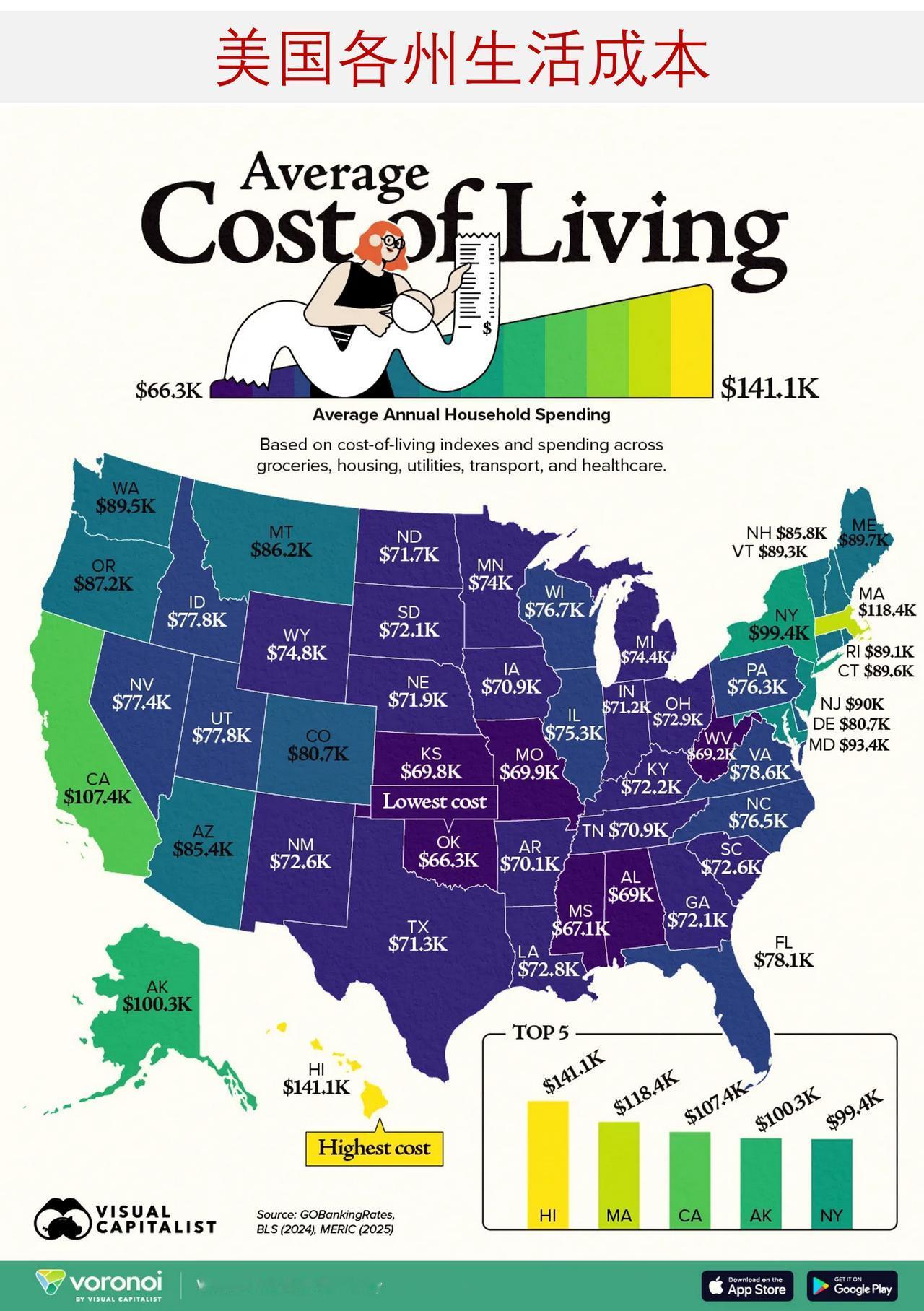 如果你生活在美国,哪里生活成本最高,哪里生活成本最低? 居住在美国不同州,年度生活开支差距最高可达7.5万美元。 依据GOBankingRates对美国劳工统计局2024年消费者支出调查的分析,以及密苏里州经济研究与信息中心截至2025年第三季度的数据,通过地图展示全美50个州的家庭年度支出差异。 从夏威夷州的141,127美元到俄克拉荷马州的66,284美元,差距十分悬殊。对许多家庭而言,居住地点本身就是影响总支出的最大因素之一。 ——生活成本最高的州 夏威夷州以年均141,127美元的家庭支出高居榜首,远超其他各州。这一数字比俄克拉荷马州高出约7.5万美元,较全美平均水平高出约6.3万美元。 受高企的房价影响,在夏威夷还清一套住房往往需要几代人的努力。当地居民的医疗支出比全美平均水平高出28%,食品杂货支出则高出33%。 马萨诸塞州(118,431美元)、加利福尼亚州(107,357美元)、阿拉斯加州(100,289美元)、纽约州(99,425美元)紧随其后,位列成本前五,共同反映出住房压力、地理偏远及整体高支出等特征。 ——生活成本最低的州 俄克拉荷马州家庭年均支出为66,284美元,是全美生活成本最低的州。 俄克拉荷马城房屋中位成交价为24万美元,住房成本相对亲民;截至2025年12月,当地房价同比仅上涨1%。相比之下,全美房屋中位价接近35.9万美元。 同时,得益于更低的税率与区域供应优势,该州汽油价格低于得克萨斯州,食品杂货价格也位居全美最低之列。 密西西比州以67,147美元位列第二,年度生活成本比佛罗里达州低1万多美元。 得克萨斯州排名第11位,年均支出71,310美元。尽管州际人口迁入量居高不下,但大规模住宅建设缓解了房价上涨压力。值得注意的是,休斯顿房价去年同比下降2.2%,中位价约为30.2万美元。 下面地图清晰揭示了一个现实:在美国,仅居住地点一项,就能让年度生活成本相差数万美元。对于计划迁居的家庭而言,这一差距带来的影响,甚至堪比收入本身。