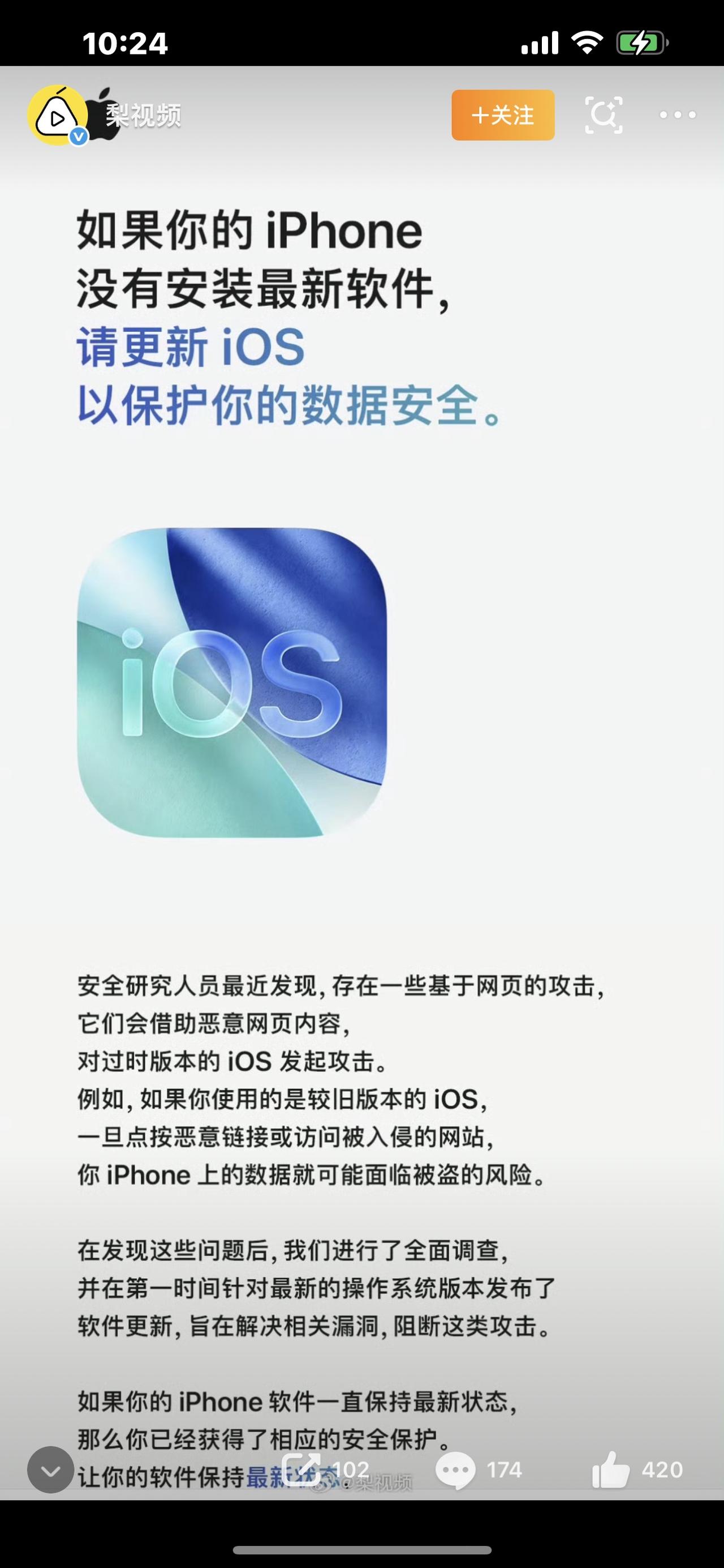 苹果官方紧急提醒:别不当回事!你的iPhone正在裸奔,数据随时被盗! (视频画面:苹果官方提醒截图、手机弹窗、黑客攻击动画、用户惊慌失措、手机数据泄露画面混剪) ⚠️ 紧急!所有iPhone用户注意! 苹果今天突然发文,语气前所未有地严肃: "不更新系统,轻点一下网页,数据就可能被盗!" 多少人习惯性忽略,觉得"更不更无所谓"? 但这次是真刀真枪的高危漏洞,黑客已经在动手了! 你的相册、聊天记录、银行卡信息,正处在危险边缘! 就在今天(4月15日),苹果官方发布重磅安全警告: 旧版iOS系统存在网页攻击漏洞! 黑客已经开始利用恶意链接、被入侵的网站搞事情。 只要你手机系统没更到最新, 不小心点了陌生链接,或是进了有毒网站, 手机就会瞬间被攻破! 照片、通讯录、支付信息、隐私聊天记录, 全都可能被黑客看光、偷走、甚至被远程控制! 更吓人的是: 这不是预警,是已经发生的真实攻击! 全国好几亿台iPhone,只要没更新,全是待宰羔羊! 很多人还在犯傻: • "更新了手机会变卡!" • "用了好几年都没事,懒得更!" • "弹窗提醒直接关掉,眼不见为净!" 你以为的"省事",其实是在给黑客开门! 平时扫码支付、存私密照片、绑着银行卡, 一旦中招,损失无法挽回! 隐私裸奔、财产被盗,哭都来不及! 大家总觉得,安全提醒是小事,官方在小题大做。 但这次转折点来了: 苹果从不说狠话,一说就是出大事! 官方明确表态: "保持系统最新,是保护你Apple产品安全最关键的一步!" 这话翻译过来就是: 不更新,你就是在裸奔! 而且苹果直接把后路都给你想好了: ✅ 能更立刻更:设置 → 通用 → 软件更新,马上升到最新! ✅ 老机不能更:赶紧开"锁定模式",能挡一波是一波! ✅ 线下帮你更:苹果店、授权店,免费检测、免费升级! 以前总吐槽苹果更新烦、耗电、变卡, 但在安全和隐私面前,那些小缺点真的不值一提! 你可以嫌弃系统慢,但不能拿身家财产开玩笑! 一部iPhone,装着我们半生的隐私和全部的身家。 我们总以为危险离自己很远, 总觉得"我又没多少钱,黑客看不上我"。 可网络时代,隐私无小事,安全无侥幸! 苹果这次的提醒,不是束缚,是保护; 不是麻烦,是责任! 别等真的被盗号、盗刷、泄露隐私,才追悔莫及。 顺手点一下更新,花几分钟时间, 守护的是你最珍贵的隐私和财产安全! 看完立刻去检查更新, 并转发给你用iPhone的家人朋友! 记住:防范于未然,永远比亡羊补牢更重要
