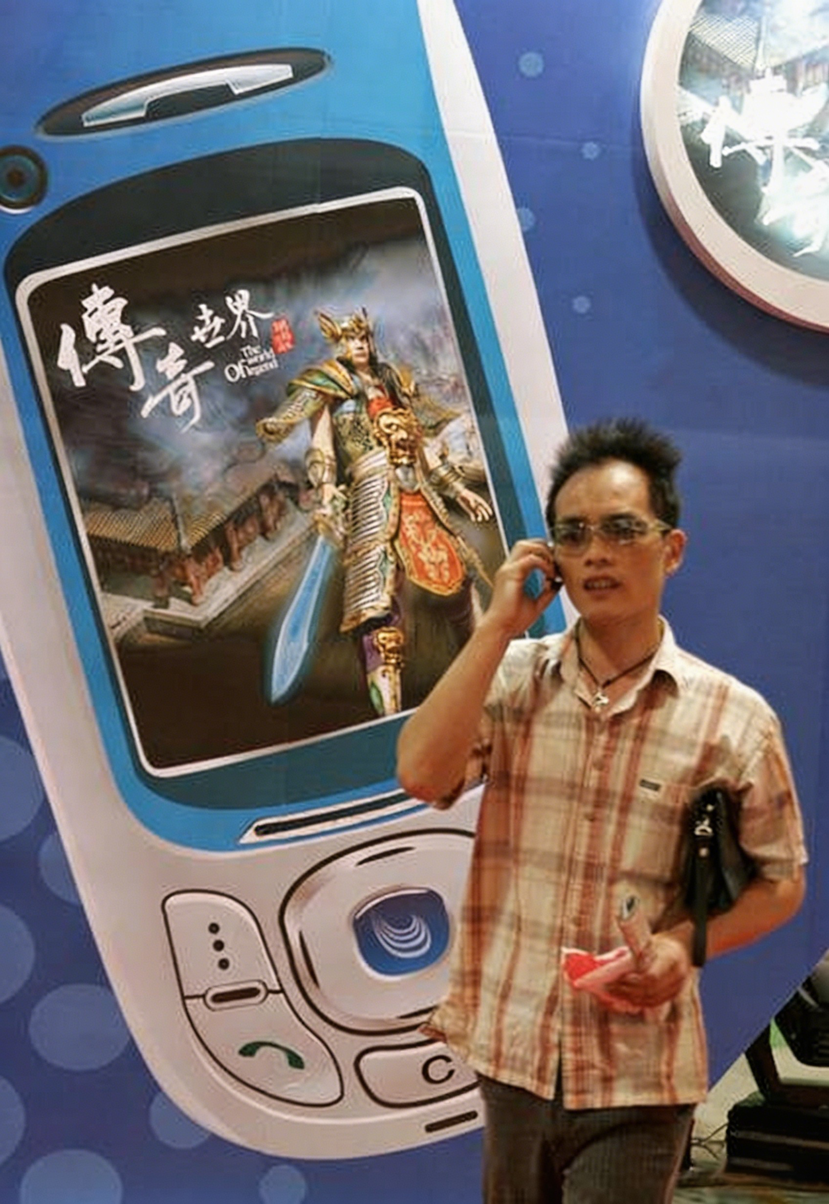【来自投稿】2005年6月2日,中国首届国际动漫展,在手机网络游戏广告前,有一人在打电话。摄影师: 吴长青