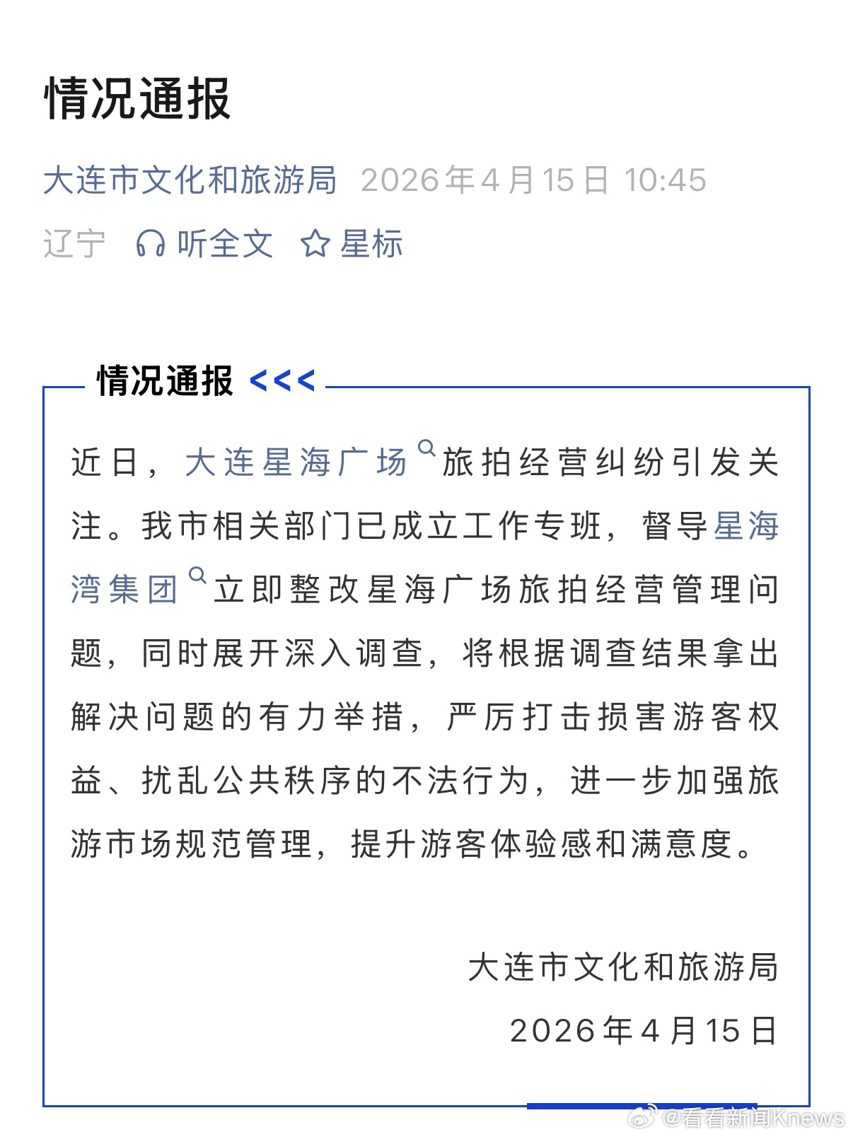 【#官方通报大连星海广场旅拍经营纠纷#】#大连星海广场旅拍乱象将整改#4月15日,辽宁大连市文化和旅游局发布情况通报:近日,大连星海广场旅拍经营纠纷引发关注。我市相关部门已成立工作专班,督导星海湾集团立即整改星海广场旅拍经营管理问题,同时展开深入调查,将根据调查结果拿出解决问题的有力举措,严厉打击损害游客权益、扰乱公共秩序的不法行为,进一步加强旅游市场规范管理,提升游客体验感和满意度。