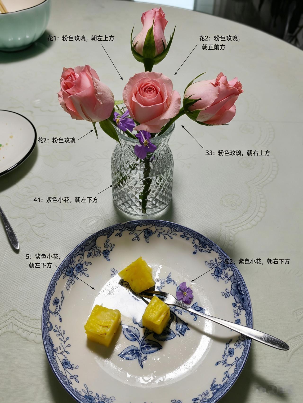 随手拍了张照片,总觉得怪怪的,为此我让豆包给我分析下,结果它还给我出了个调整图。 今天老公还得去培训,不过他说熟悉路线了,晚点出门都没事。他可以吃完饭送完孩子再走。 那我肯定乐意!那爷仨走了,剩下我把剩饭剩水果给解决了。吃到还有三个小菠萝时,才想到把小花拿出来拍个照。 昨晚这小花瓶本来插了五支花,但是今早起来我发现有两支失水弯了,我就剪短扔进了大花盆里。 最后拍下来,就是这么个样子,总觉得有些不好看,就让豆包给我分析下。 豆包说,中式插花里,三枝常被称为“天、地、人”造型。主枝(天),得是最高的;副枝(地):第二高的枝,和主枝形成呼应,不能和主枝平行;客枝(人):是最矮的枝,一般朝向和主枝相反,让画面不呆板。 它说我这三只花高度太平均,没了层次;朝向太“正”,没有形成三角动态。还说小紫花抢戏,喧宾夺主。[捂脸][捂脸] 最后,它还给出了个调整图。我感觉我不会了,这不就是多加了一支,然后盘子里飘了朵紫花吗?
