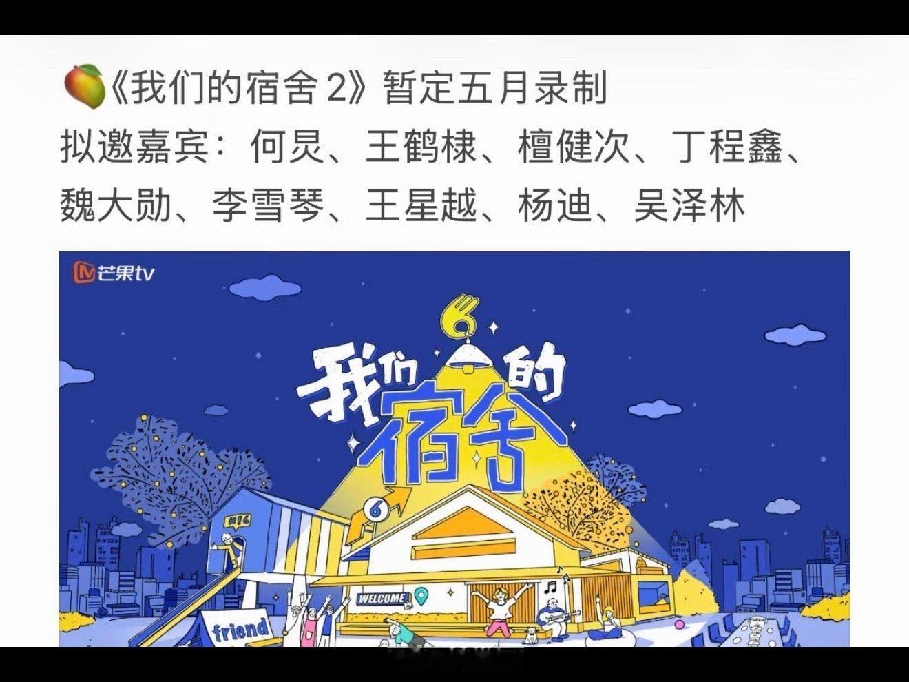曝我们的宿舍2拟邀名单 网传我们的宿舍2暂定5月录制 哟哟哟哟,粉丝和观众心心念的下饭综艺《我们的宿舍2》终于要来了!!!!新综暂定五月录制,拟邀嘉宾:何炅、丁程鑫、王鹤棣、檀健次、王星越等,老朋友们回归,等不及看正片了!!!