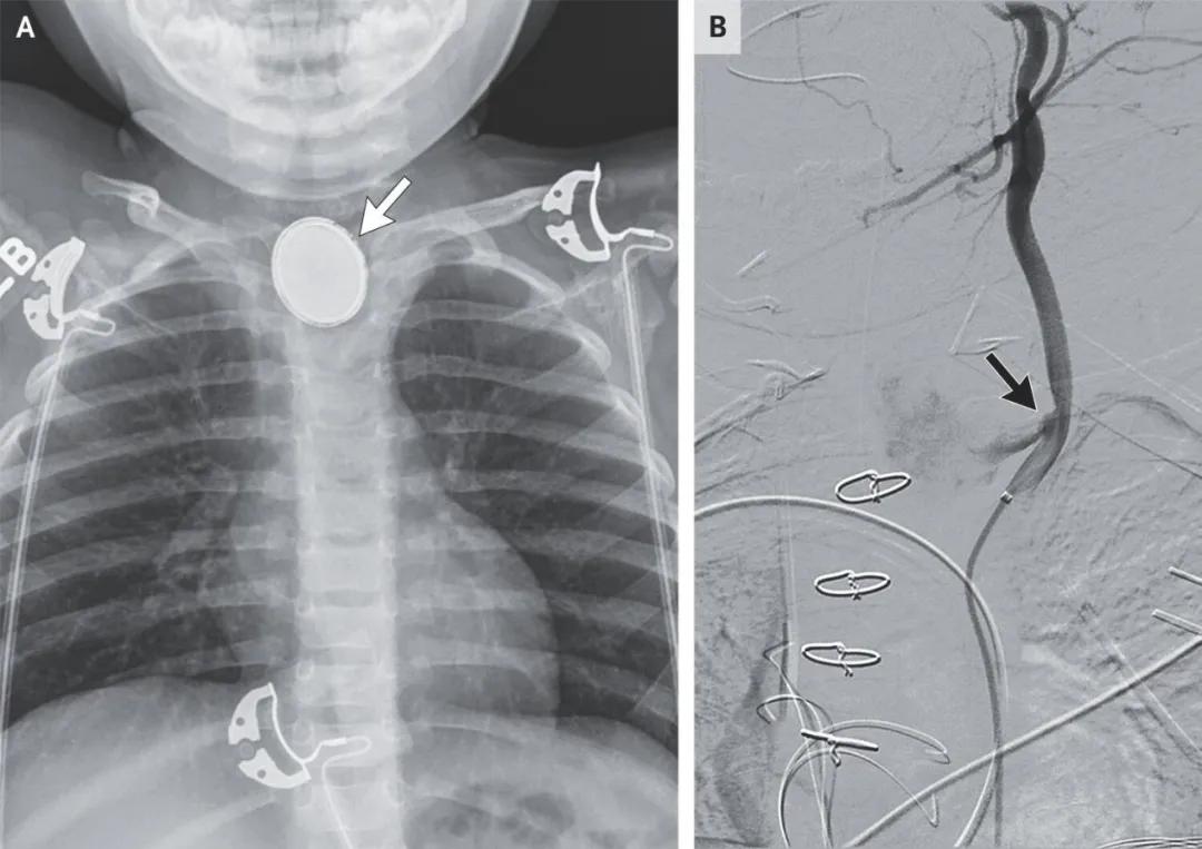 带孩子的爷爷奶奶注意了⚠️孩子误吞纽扣电池有多危险?不是取出来就没事,有的会突然呕血丧命!先来看两个案例: 案例一:一个月大的婴儿,家长发现吃不下去奶,同时呼吸困难,送往医院拍片子发现食道里面卡着一个纽扣电池。紧急做了胃镜,取出纽扣电池。胃镜检查并没有看到食道有什么损伤。但是在10个小时以后突然出现呕吐鲜血。紧急做了血管造影,发现食管和左颈总动脉之间因为纽扣电池的压迫已经造成了组织损伤,最终形成瘘管。动脉里的血穿过瘘管从食管喷出,紧急止血后转危为安。 案例二:2 岁幼儿,因误食异物住院,胃镜检查发现是一枚纽扣电池。同时发现被纽扣电池卡住的地方食管黏膜充血、肿胀,少量渗血,未见明显穿孔。住院一周好转后出院。出院 3 天后突发呕血,抢救无效身亡。尸检鉴定显示被纽扣掐住的食道与胸主动脉形成瘘管,血从主动脉涌向食管,最终引起窒息和出血性休克。 纽扣电池一旦卡在食管里,短时间内就可能持续放电,并产生强碱性腐蚀,迅速灼伤周围组织。 更可怕的是,有些孩子当时看起来没事,甚至已经出院,几天后却突然加重, 原因就在于电池造成的损伤并不会随着“取出”立刻停止,严重者会形成食管与大血管之间的瘘管,一旦破裂,就是致命性大出血。 婴幼儿误食纽扣电池后,往往不能清楚表达不适症状,只是哭闹、吞咽不适、咳嗽,很多家长会误以为是感冒、咽炎或普通肠胃不适,从而错过最佳处理时间。 所以要记住:只要怀疑孩子吞了纽扣电池,第一时间去医院,尽快拍X线,尽快处理。 即使已经取出,也一定要按医生要求复查、观察,千万别觉得“拿出来就安全了”。 还有就是类似于纽扣电池、硬币、圆珠笔等含有细小部件的物品平常一定要放在婴幼儿接触不到的位置。