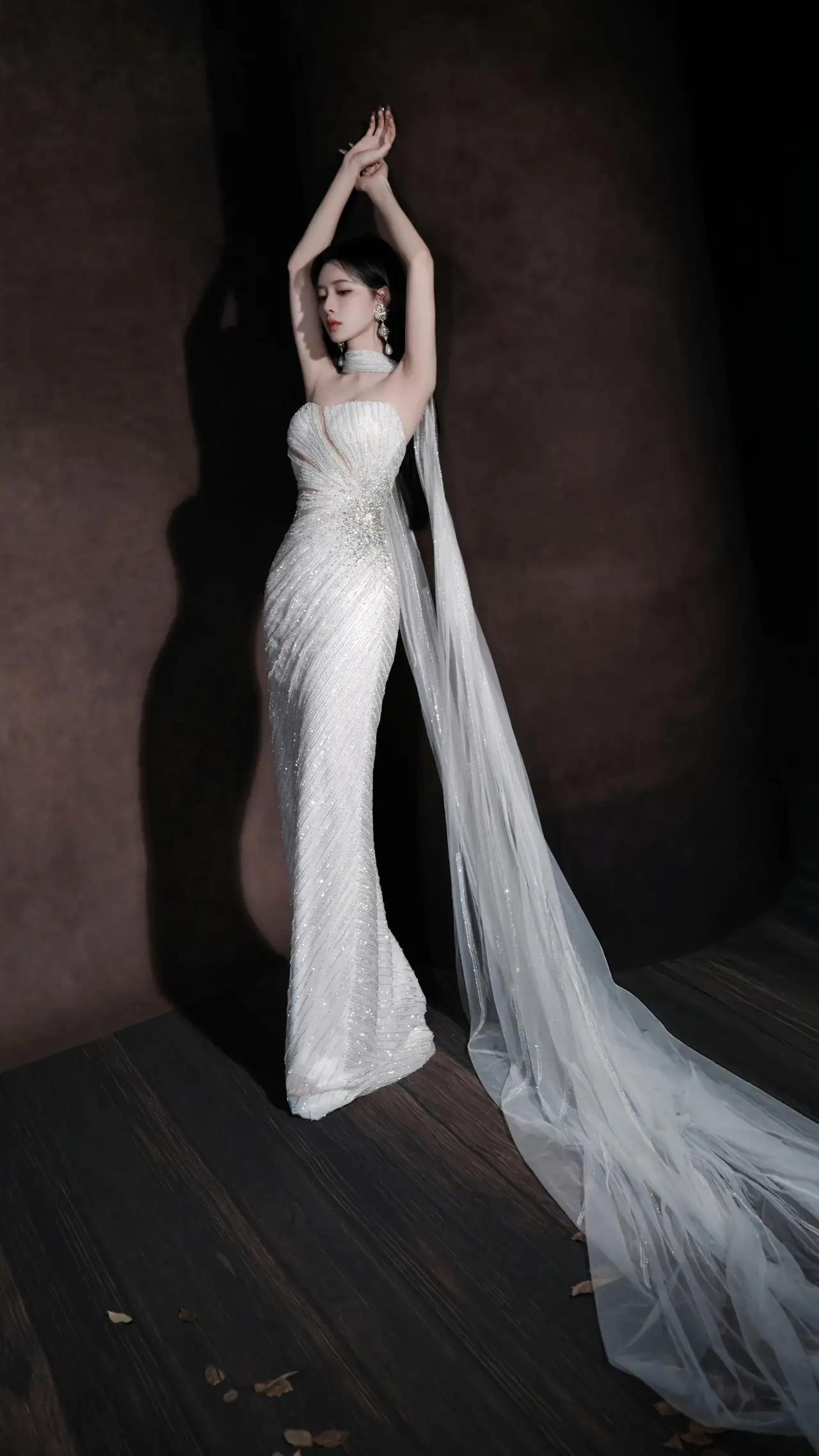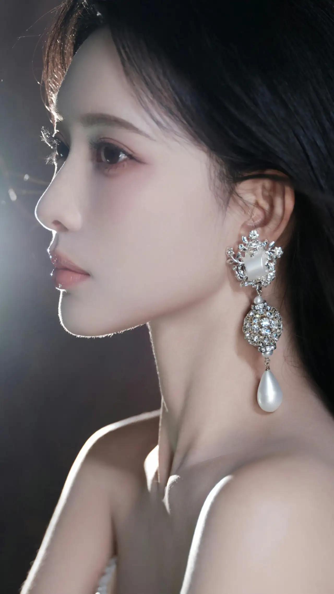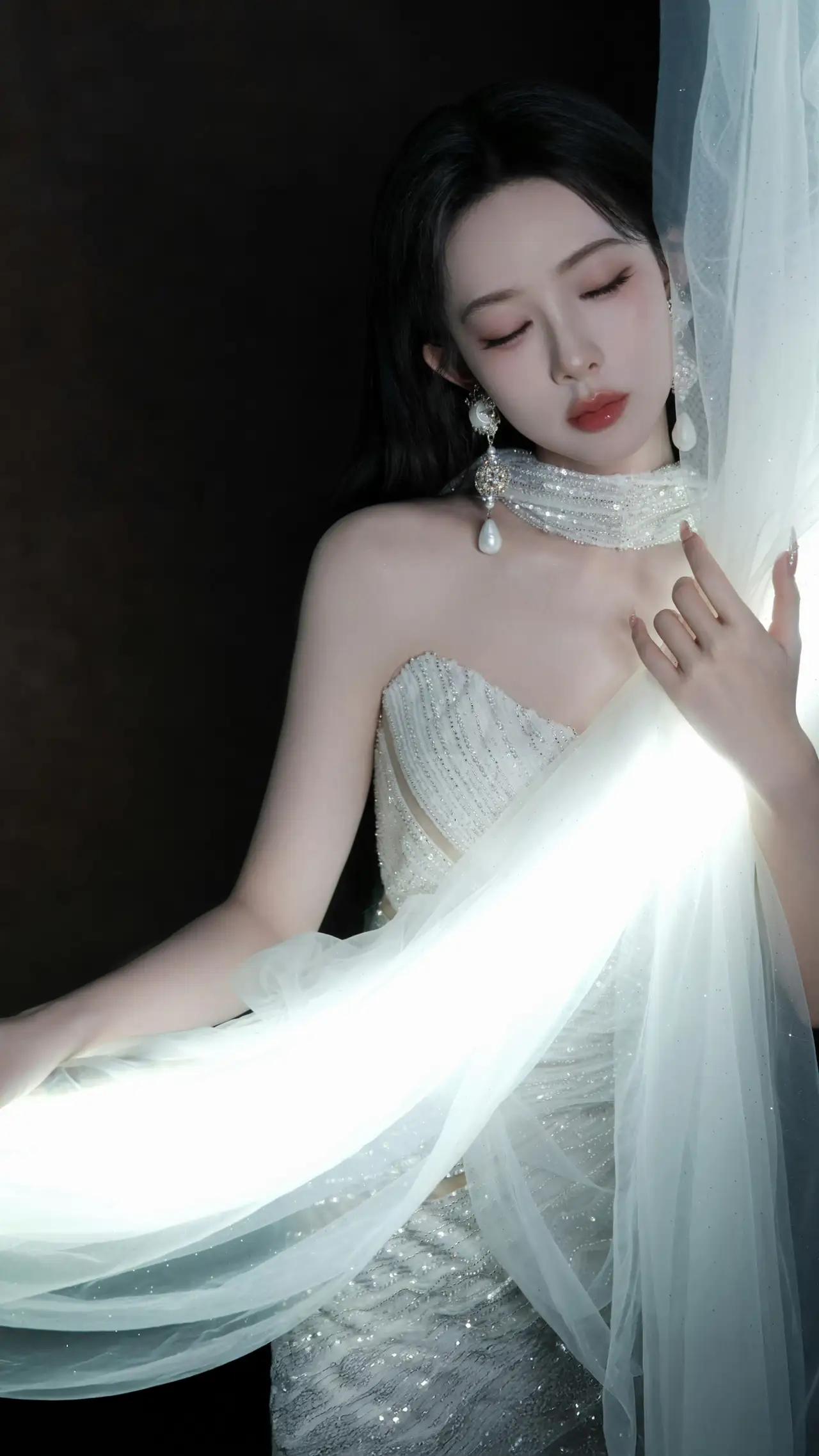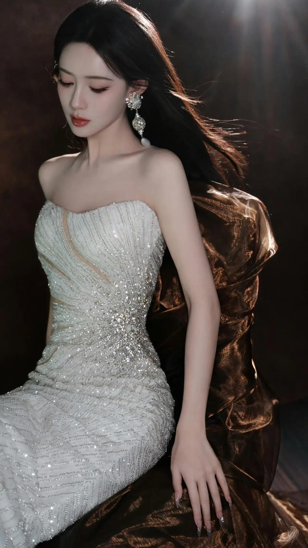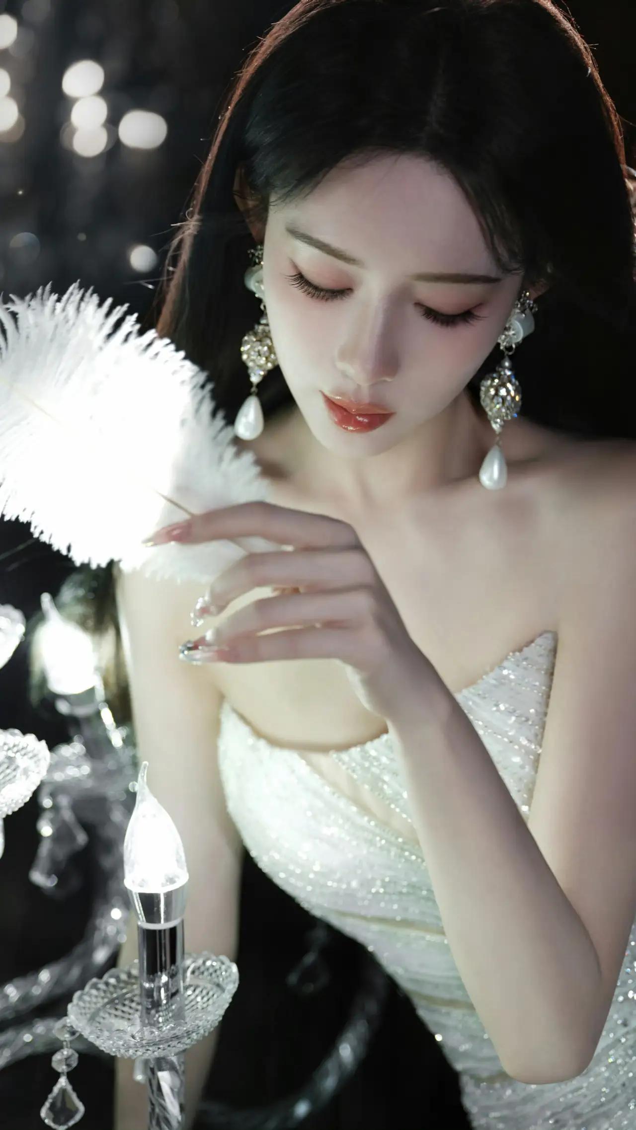 美女壁纸~孟子义,光影织就浪漫,碎钻缀满温柔,一袭抹胸闪钻白裙,搭配珍珠钻饰耳坠与颈间钻圈,将优雅与贵气揉进每一寸细节