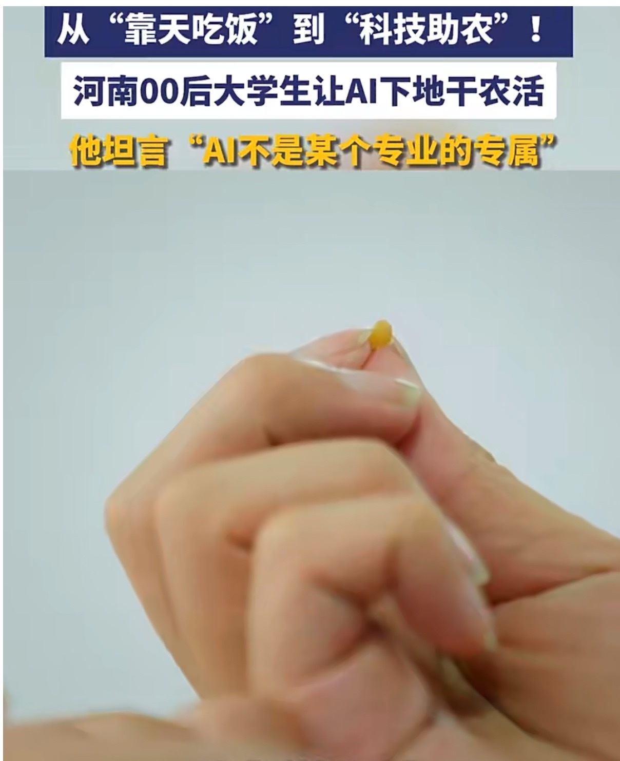 河南00后大学生让AI下地干农活新时代的大学生,总是能用新方法去解决问题。AI加农活,应该能碰撞出新的火花……河南00后大学生让ai下地干农活