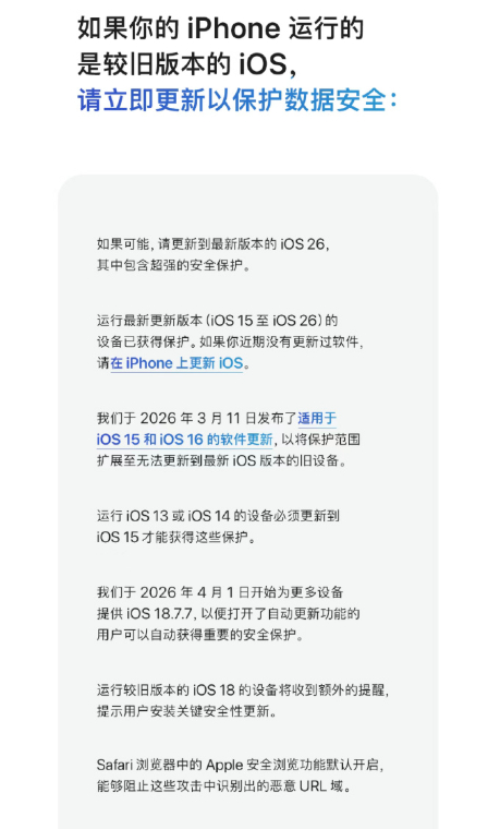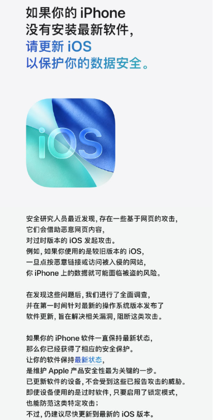 上次的安全问题被苹果重视起来了提醒大家把设备更新至最新系统不过还停留在老版本的用户应该还挺多吧你们现在还是ios几苹果官方发文提醒