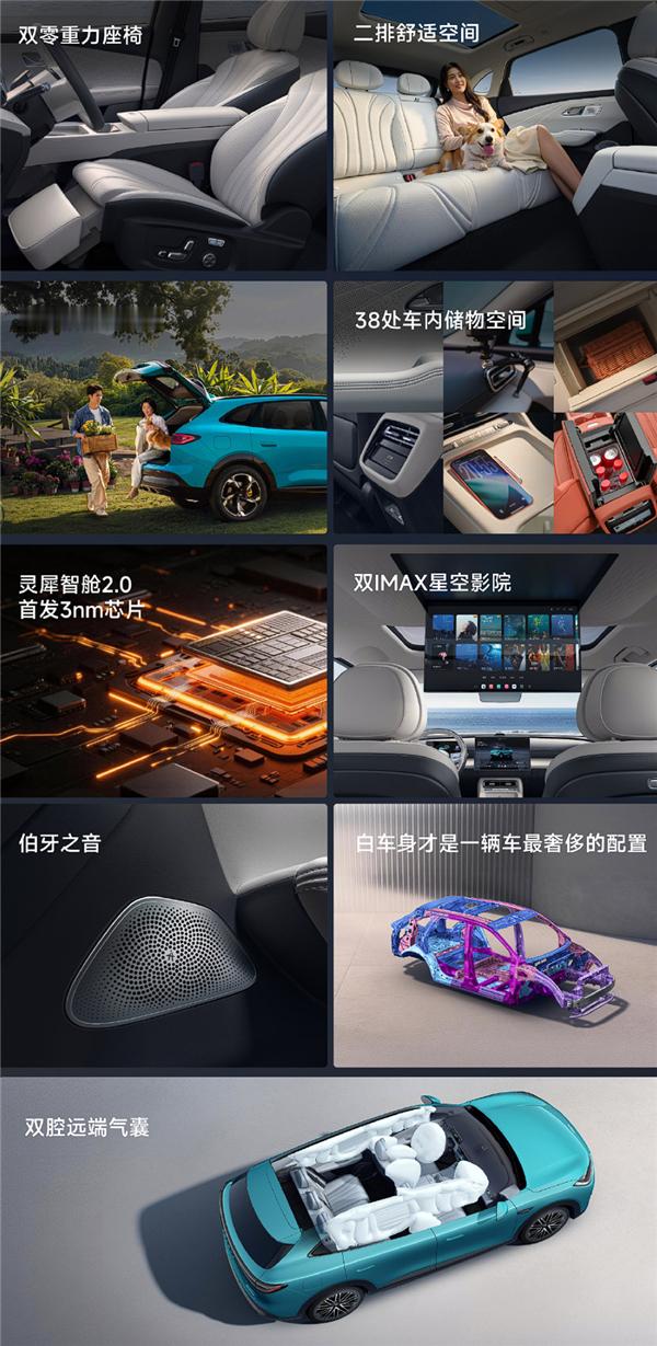 新车长4870mm,轴距2920mm,二排腿部空间达1037mm,支持双大床模式,后备箱拓展至1597L。顶配可选零重力座椅、17.3英寸吸顶屏、1080W 23扬声器音响、全景天幕+遮阳帘。