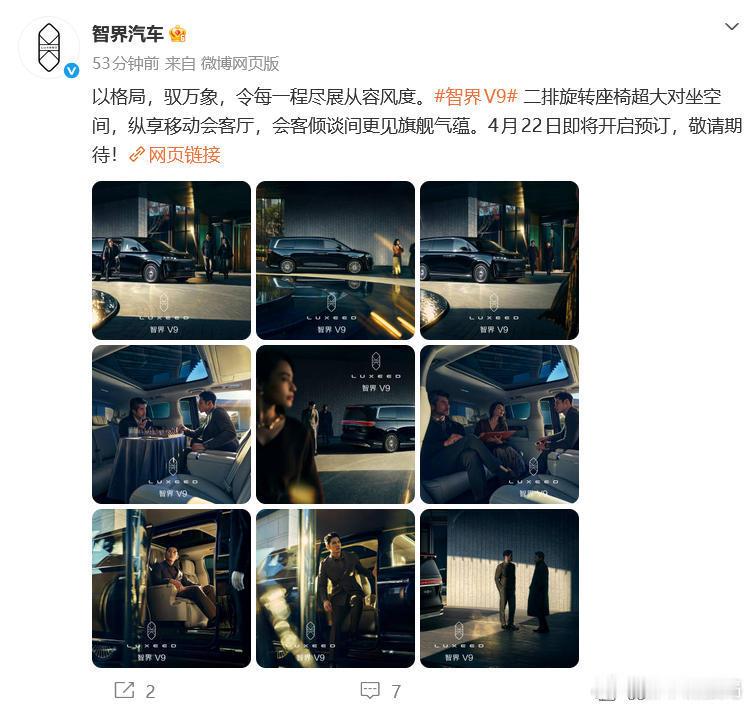 智界V9将4月22日开启预订 4月15日,正式官宣智界 V9 将于 4 月 22 日开启小订。新车情报局