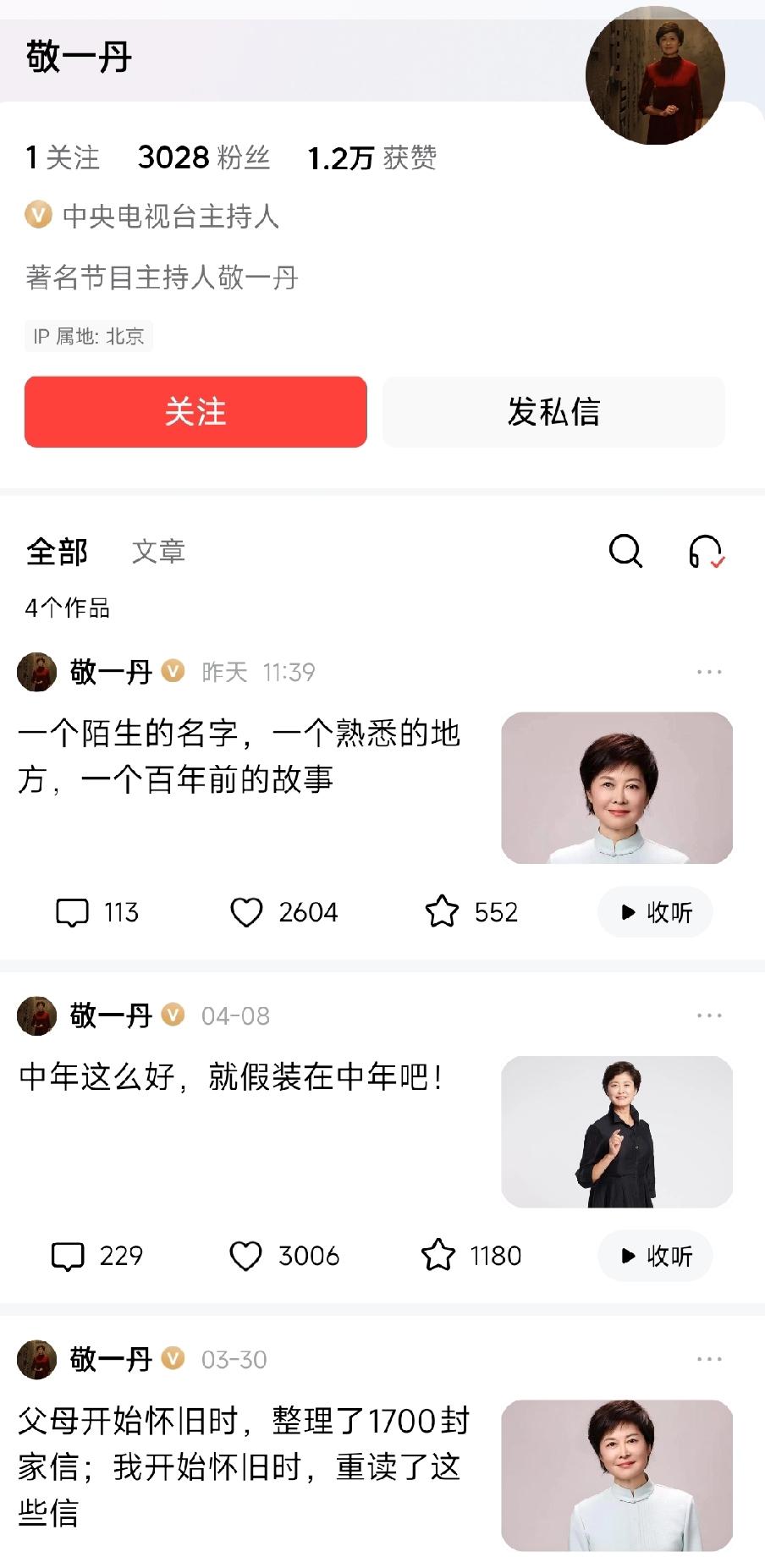 敬一丹老师来头条了! 短短几篇文章,点赞量惊人。 这就是名人自带的流量吧! 作为老媒体人, 撰文出书自然是信手拈来, 但一直以来还真没拜读过敬老师的文章。 印象中她还是那个神采奕奕的电视主持人。 现在已过起了悠然自得的退休生活, 做起了自媒体人。 与我们岂不是成了互联网“同事”[憨笑] 敬一丹