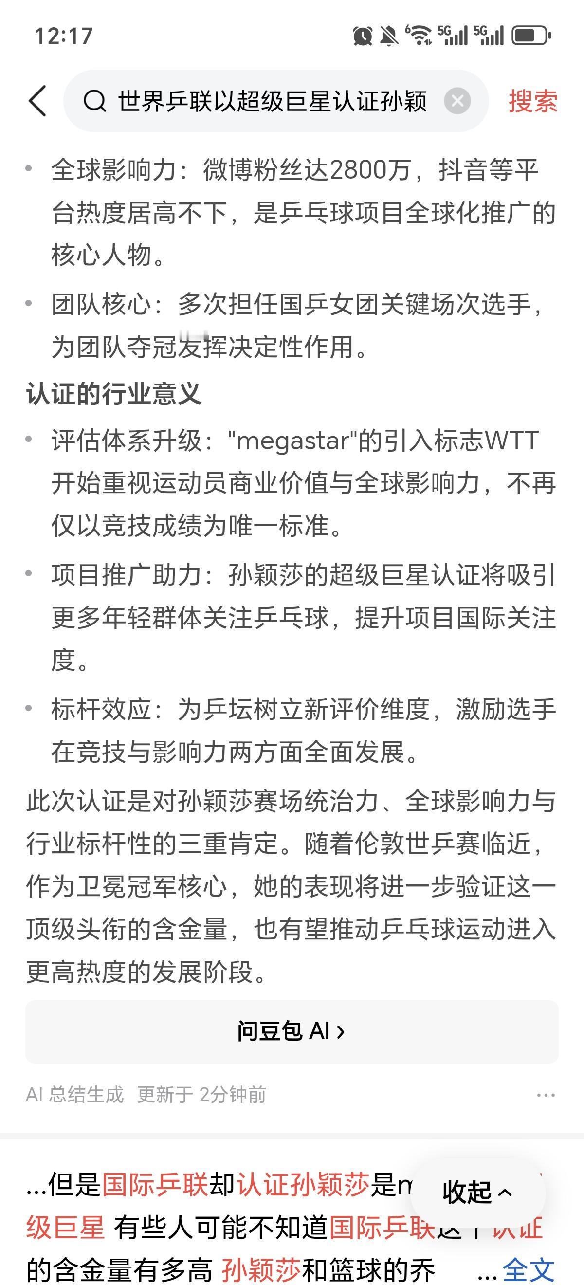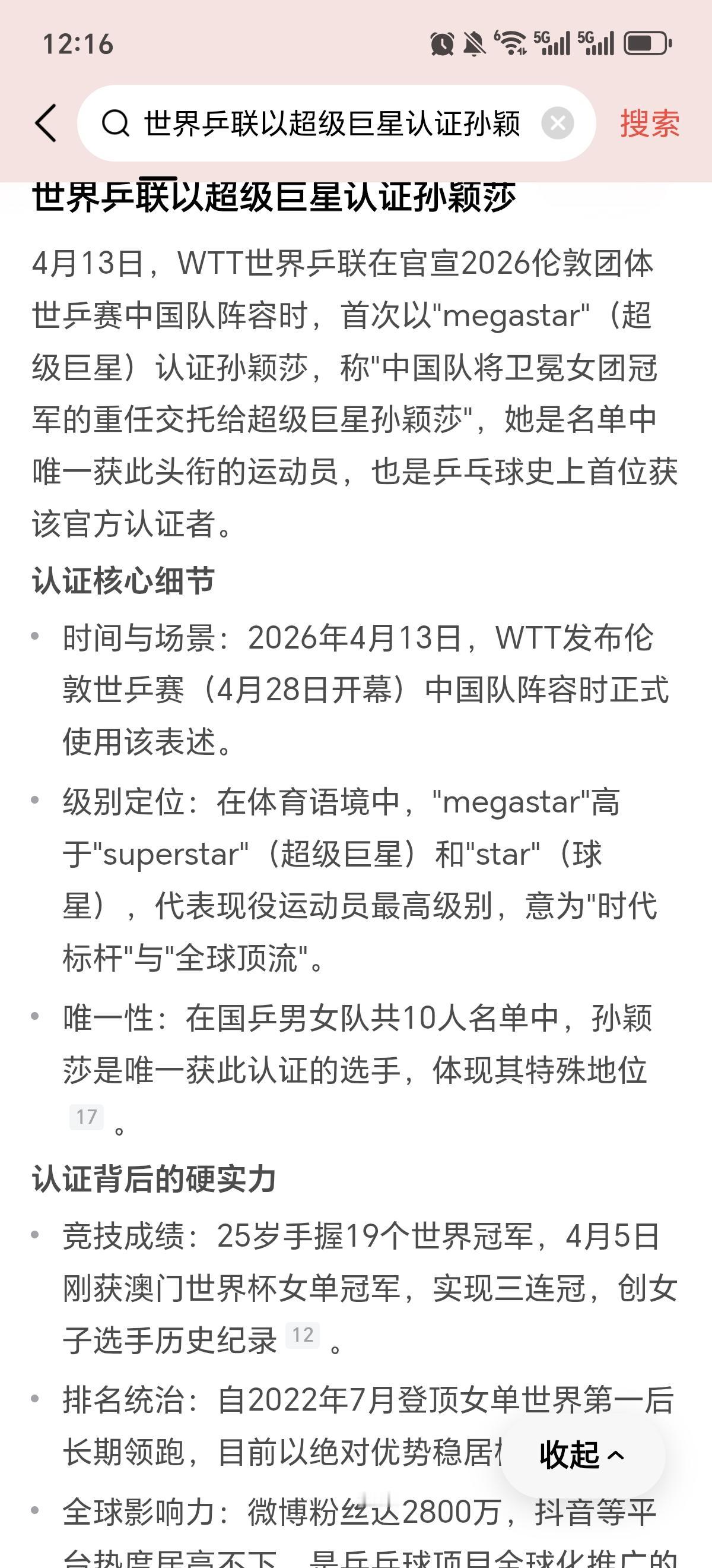 好开心啊! 国际乒联认证孙颖莎是:“超级巨星”。 莎莎不仅得到了全体国人的一致认可,还以巨大的影响力走向世界,成为独一无二被认证的超级巨星。 正如网友所说的,我喜欢每一位国乒队员,尊敬他们,但我还是最偏爱莎莎,唯有莎莎是心头好! 在我家里,老老少少十几口人都喜爱莎莎,无论她和谁打比赛,绝对支持她! 我们确实有点儿偏心,但这偏心是因为莎莎无与伦比的赛场魅力,赛场之外的邻家妹妹的可爱,一个十分纯粹的运动员。 国际乒联认证莎莎是超级巨星,对她的赛场统治力、全球影响力和行业标杆三方面予以肯定,这还有什么好说的?必须十二万分地支持她!一如既往地喜爱她!
