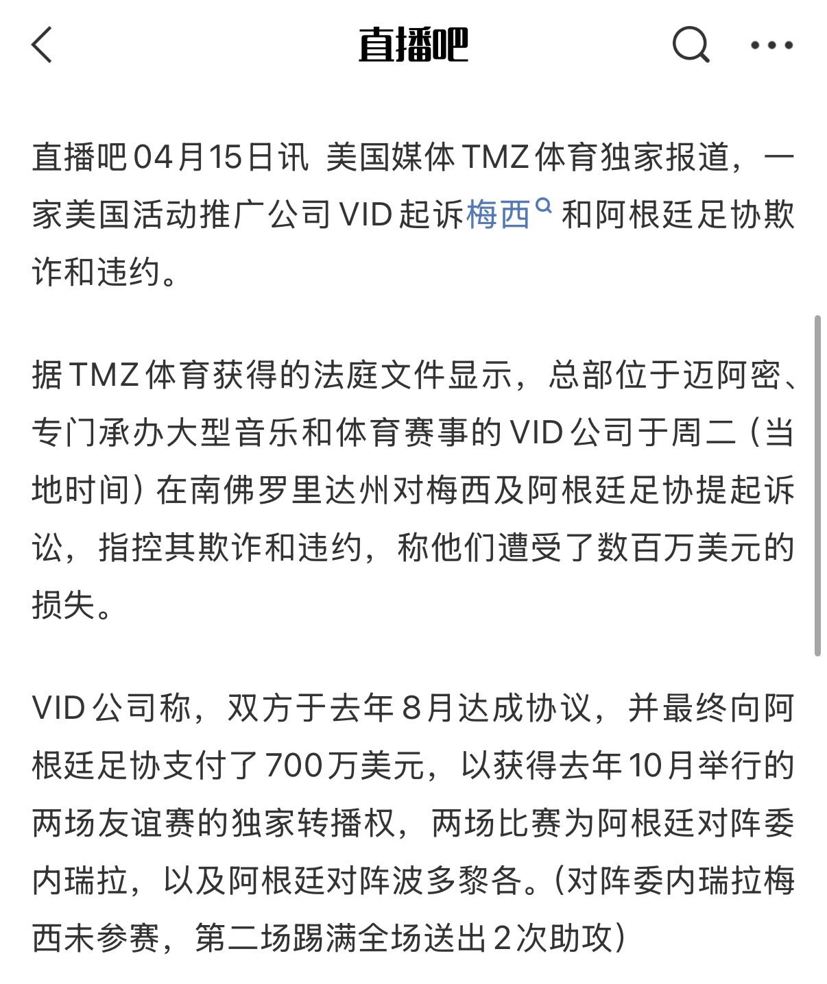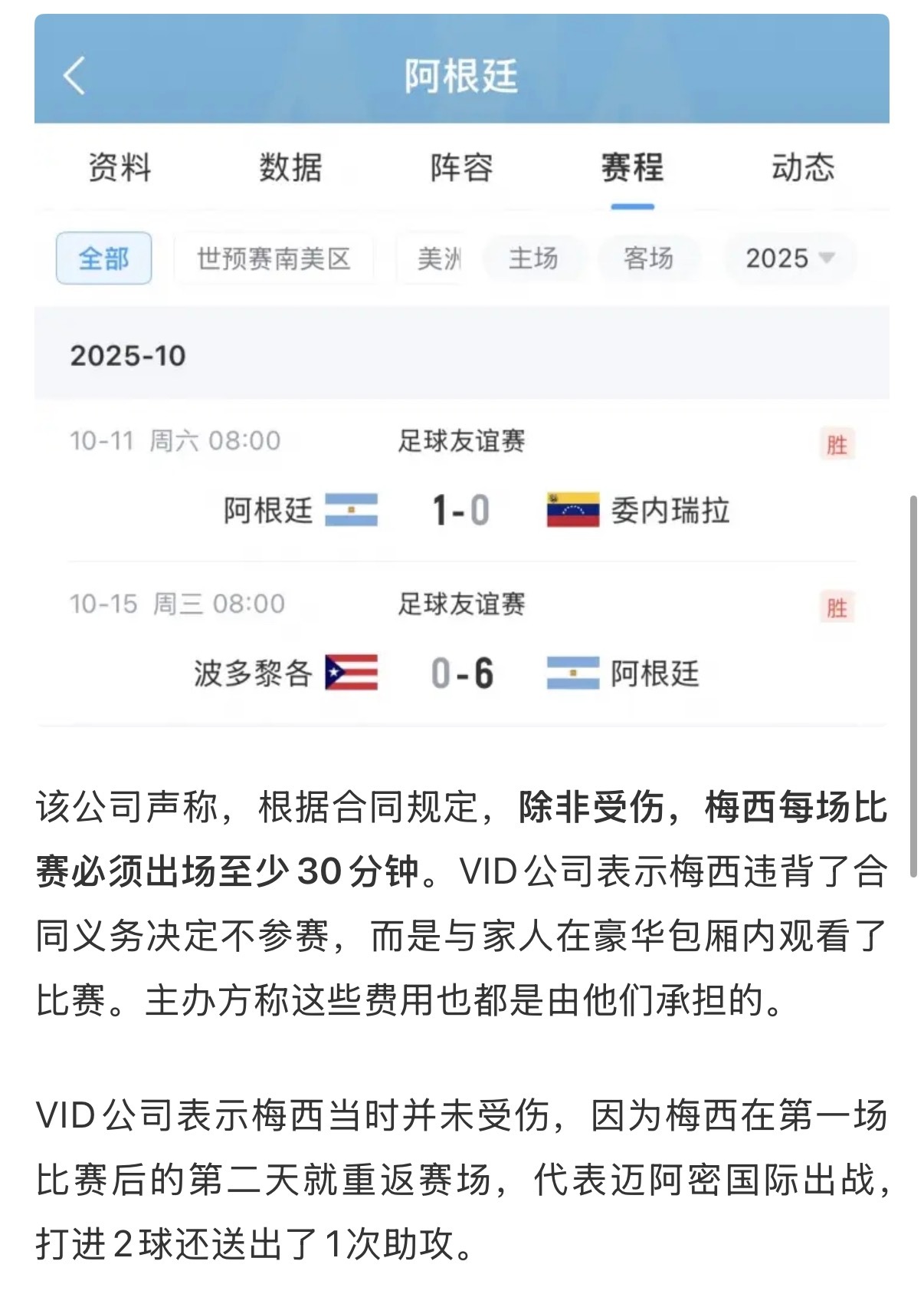 我没觉得这个事有啥。首先合同是afa签的,其次到底要求是总共出场时间还是每场出场时间就掰扯呗,反正两场比赛加起来梅西甚至打满90分钟而且贡献了助攻。所以说人家有合同的都直接拿合同说话,那么写小论文往zz舆论上掰扯到现在不敢拿合同的,我就不好说了还想拿这事泼梅西脏水那我就要问霍某人一句你怎么不去起诉了哈 梅西被起诉梅西因未登场被索赔700万美元