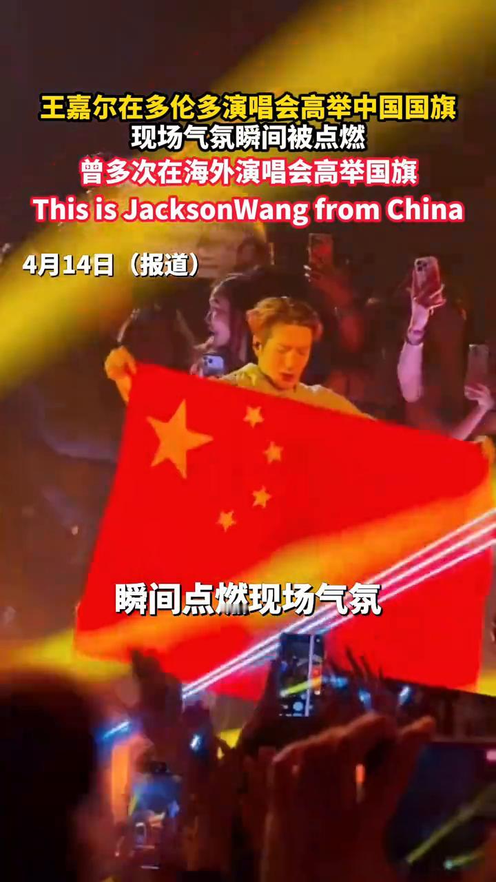 王嘉尔在多伦多演唱会高举中国国旗,现场气氛瞬间被点燃。 4月14日(报道),王嘉尔世界巡演在加拿大多伦多举办。演出过程中,王嘉尔在舞台上高举中国国旗,瞬间点燃现场气氛,观众欢呼声此起彼伏。北美六站巡演全部售罄,累计观众超3.5万人次,其中90%为非亚裔面孔。他曾多次在海外演唱会上高举国旗,表明自己来自中国。不少网友被他真挚的爱国情怀打动。 中国男孩JacksonWang,谢谢。