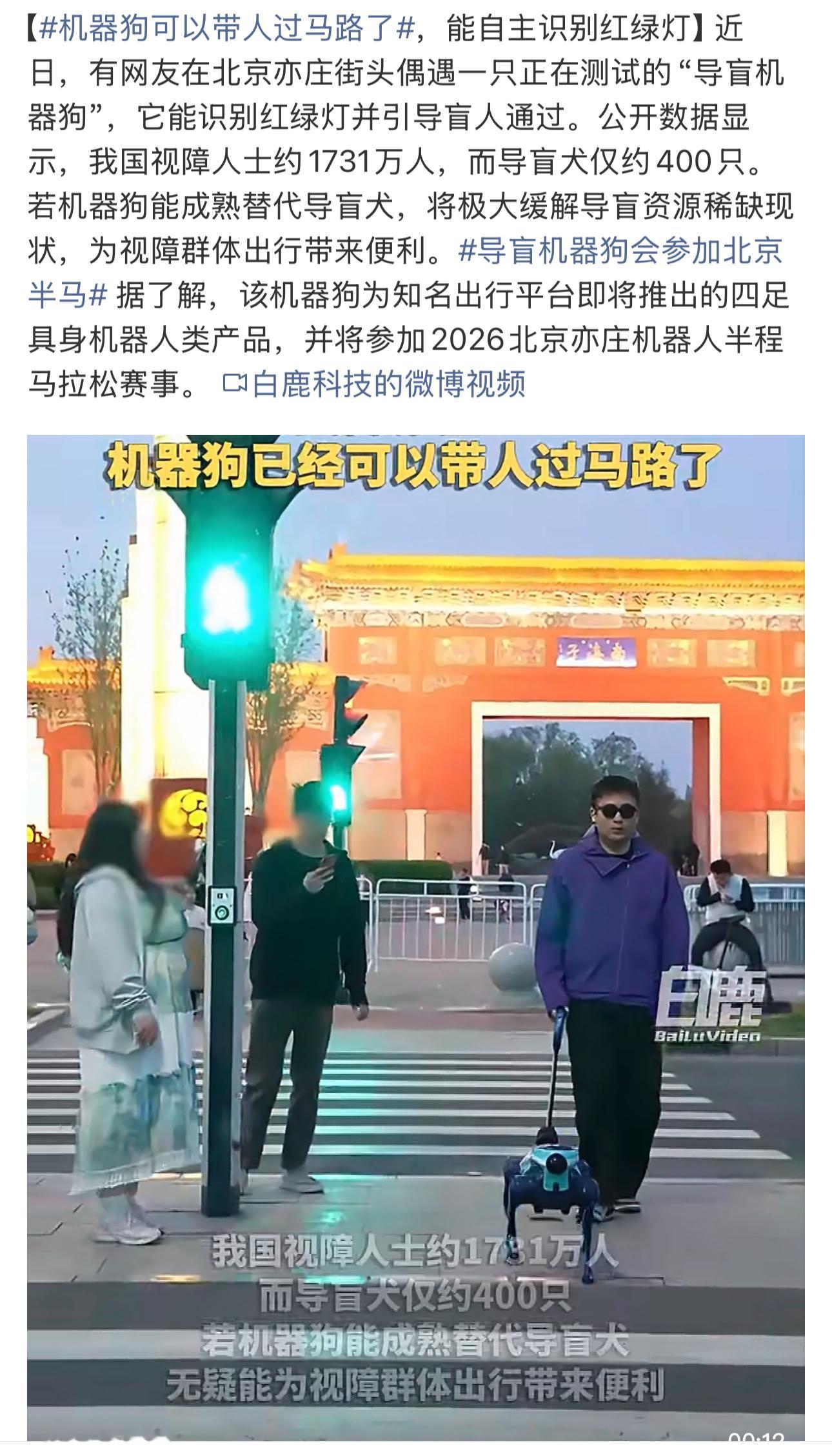 这才是科技进步的好事,机器狗发挥作用的稳定性,应该是远高于导盲犬的……机器狗可以带人过马路了导盲机器狗会参加北京半马