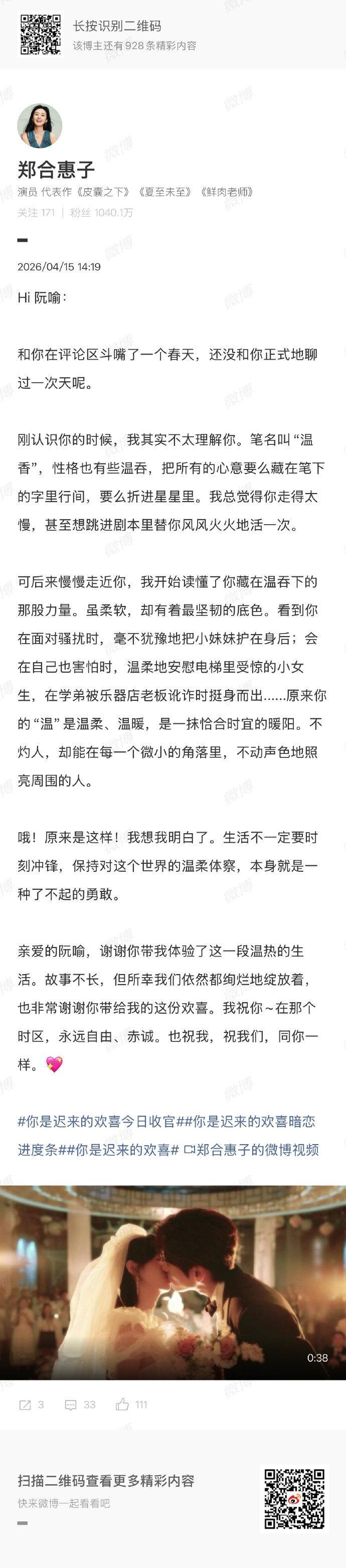 郑合惠子发长文告别你是迟来的欢喜郑合惠子告别你是迟来的欢喜郑合惠子发长文告别你