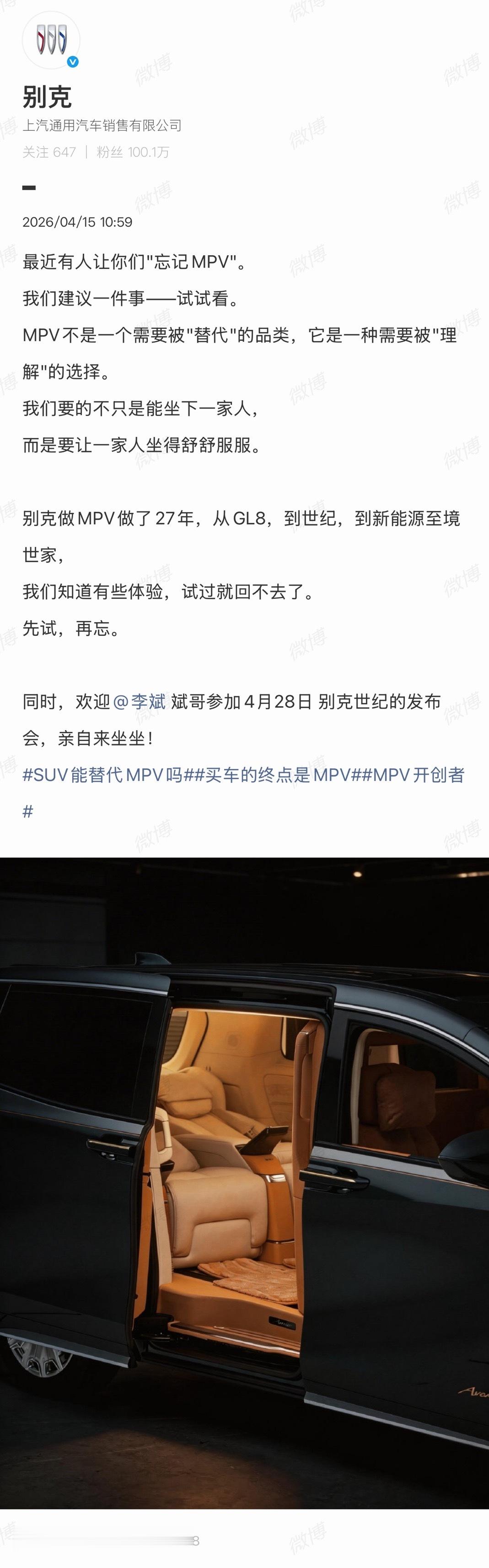 做企业,确实要看资源分配,但做品牌,得敬畏每一种生活方式。斌哥如果真是应约去了4月28日别克世纪的发布会,那别克也真是蹭上了SUV能替代MPV吗