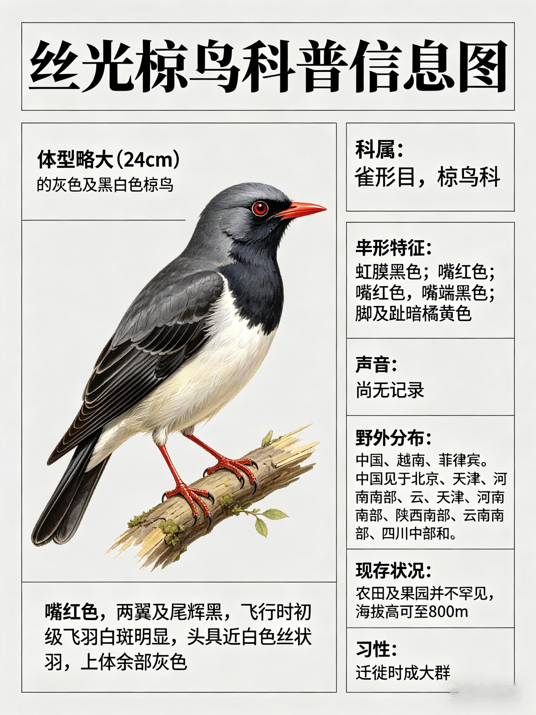 ·外形特征:体型略大(24cm)的灰色及黑白色椋鸟。嘴红色,两翼及尾辉黑,飞行时初级飞羽的白斑明显,头具近白色丝状羽,上体余部灰色。虹膜黑色;嘴红色,嘴端黑色;脚及趾暗橘黄色。