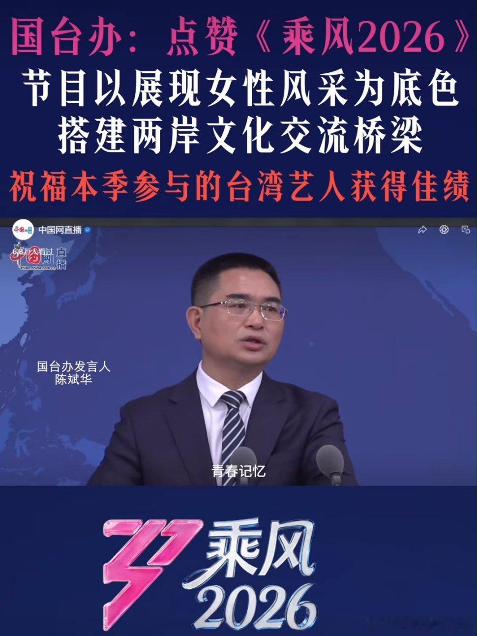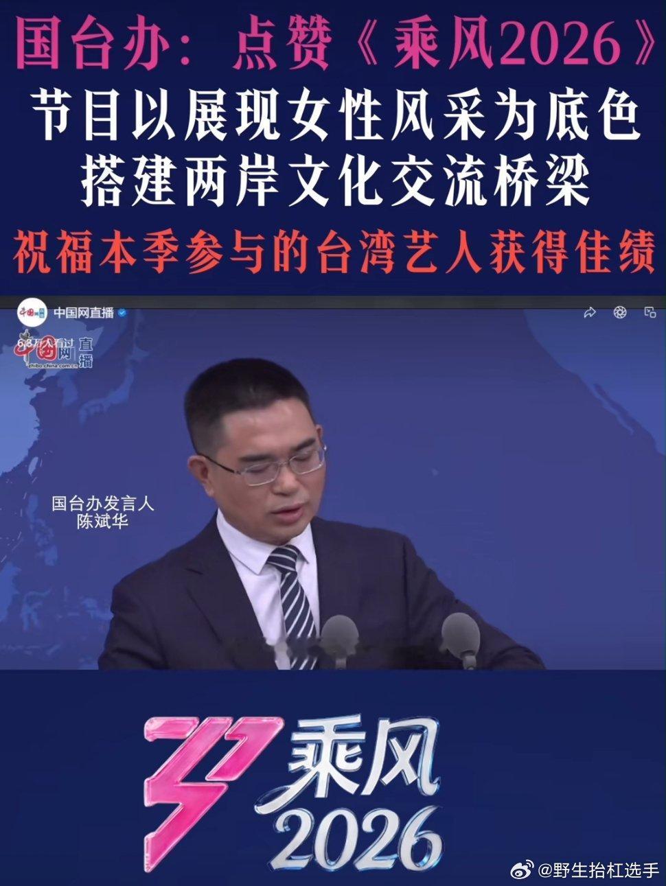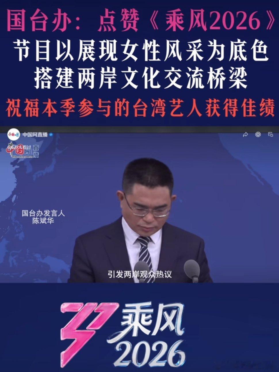 国台办点赞乘风2026国台办都夸乘风2026啦!两岸姐姐同台竞演,以声传情以艺交心,勾起满满青春记忆,祝姐姐们都能乘风破浪拿好成绩!乘风2026