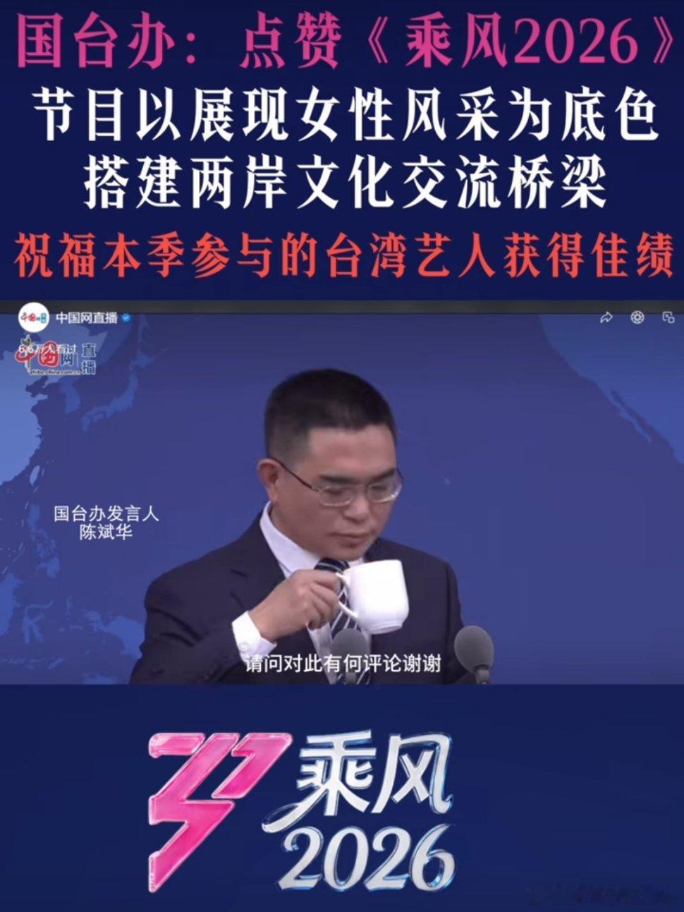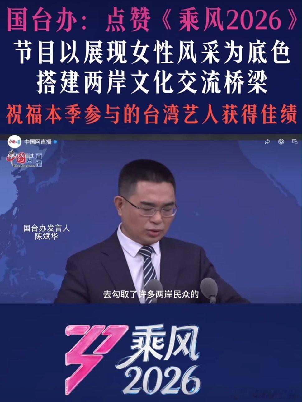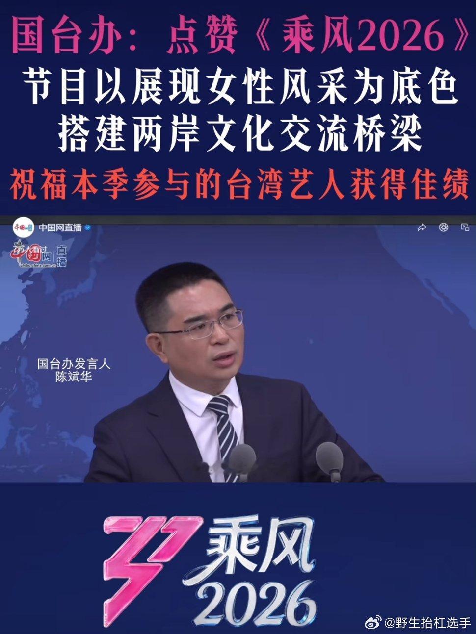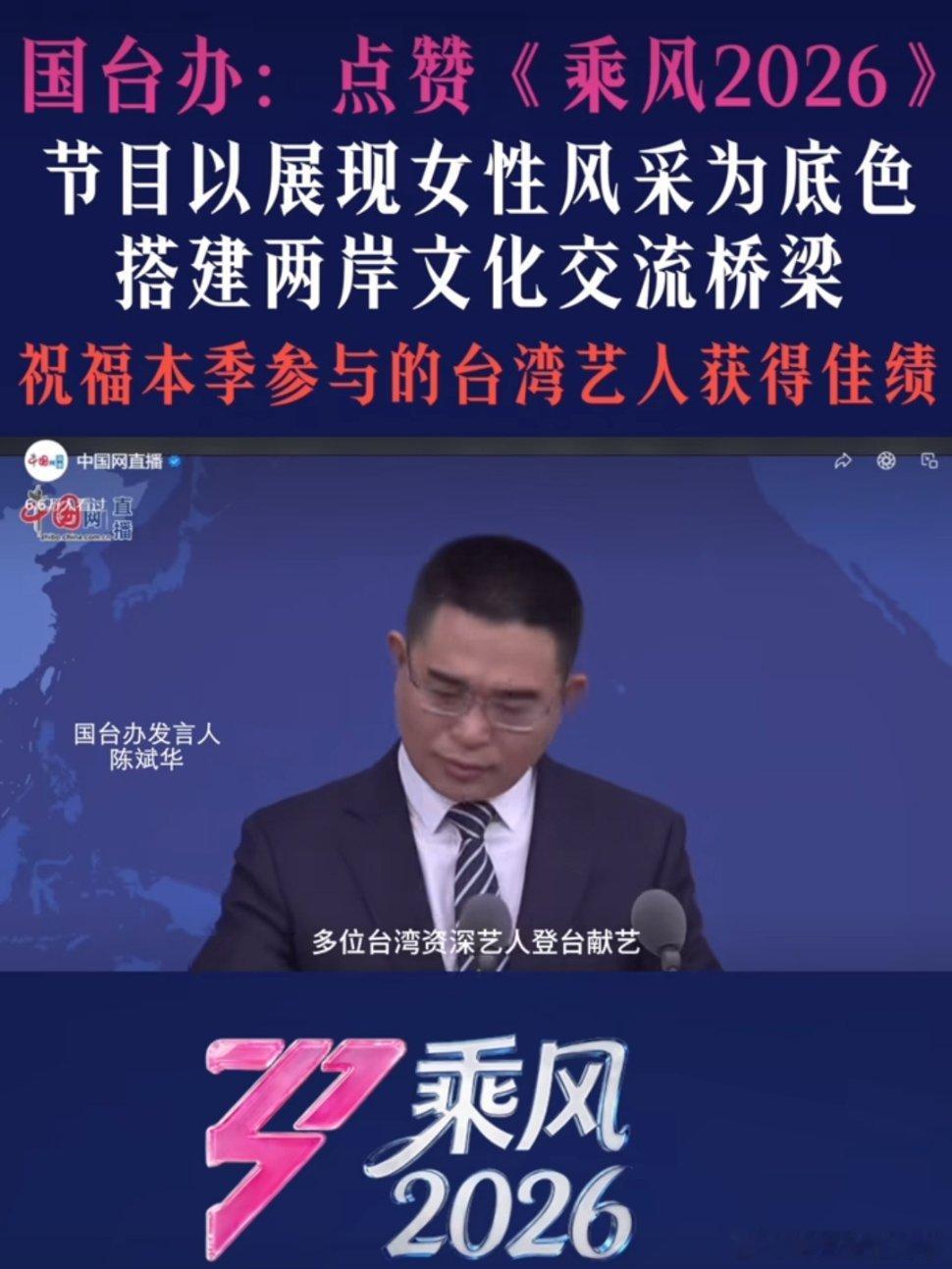 国台办点赞乘风2026国台办都夸乘风2026啦!两岸姐姐同台竞演,以声传情以艺交心,勾起满满青春记忆,祝姐姐们都能乘风破浪拿好成绩!乘风2026
