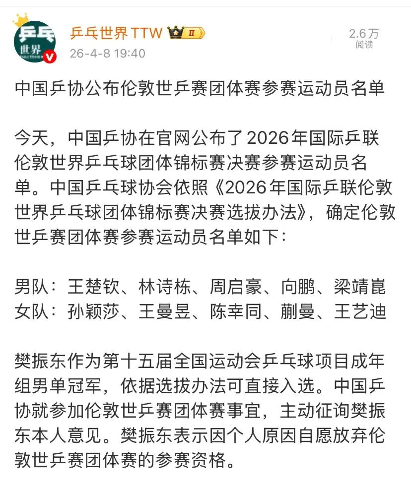 缺樊振东的伦敦世乒赛,国乒男队没那么好欺负,五虎战将拼就是了 伦敦世乒赛名单一出,樊振东缺席确实让不少球迷心里咯噔一下,甚至有人觉得这是男队“史上最难”的一关。这种担心不无道理,毕竟小胖的稳定性和大赛气场,目前还是独一档。 不过,名嘴侯英超倒是有不同视角。他认为有王楚钦坐镇一单,队伍的基本盘其实没丢。至于林诗栋、梁靖崑、向鹏、周启豪这几位,关键是要卸下“保冠军”的包袱,把自己当成挑战者去拼。有时候,心态归零反而能打出意想不到的爆发力。 说实话,这支国乒男队虽然少了定海神针,但绝非任人拿捏的软柿子。年轻队员冲劲足,老将经验也在线。比赛肯定是一场硬仗,但与其过早悲观,不如多给点耐心。看他们在伦敦放手一搏,或许正是新阵痛期里最解渴的一剂良药。