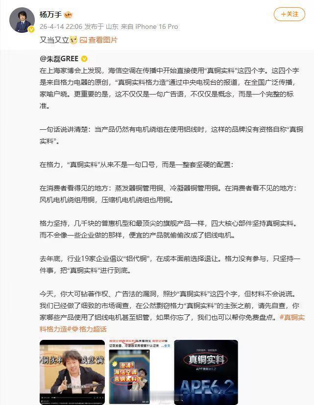 14日,格力电器CMO朱磊在微博发声,直指海信空调在宣传中直接套用格力原创的“真铜实料”概念。朱磊言辞犀利地强调:“只要产品电机绕组还在用铝线,就无权自称‘真铜实料’。”对此,海信高管杨万手当晚回击“又当又立”,并晒出一份《空调铝强化应用研究工作组成员申请表》,申请表显示格力电器赫然在列。(新浪科技)